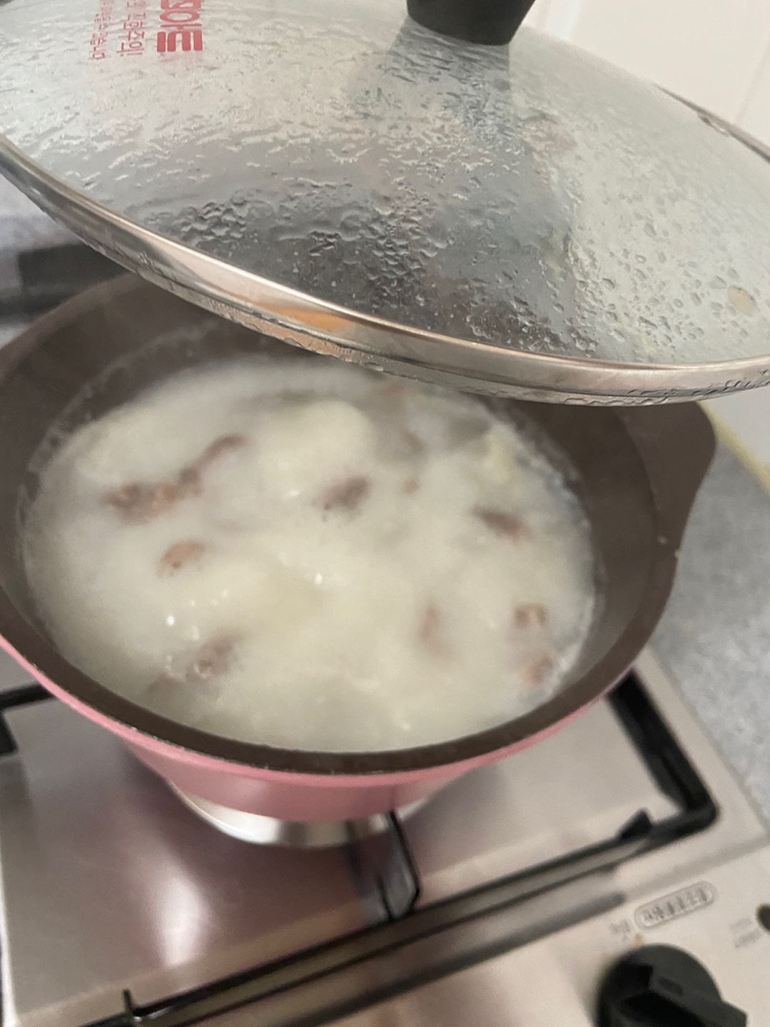 이렇게 깔끔하면 요리하고싶어지잖아요 사장님! 저희는 아이도 있기 때문에 아이 음식은 전부 펜션안에서 만들어 주었습니다. 저희부부는 해산물을 너무 좋아하기 때문에 항상 아이 식재료는 미리 챙겨가 요리를 해줍니다. 가스렌지가 너무 깨끗해서 한번 감탄하면서 사골한우스지국을 해줬습니다. 해산물을 먹을까 했지만 첫날은 소고기 파티파티 했습니다.