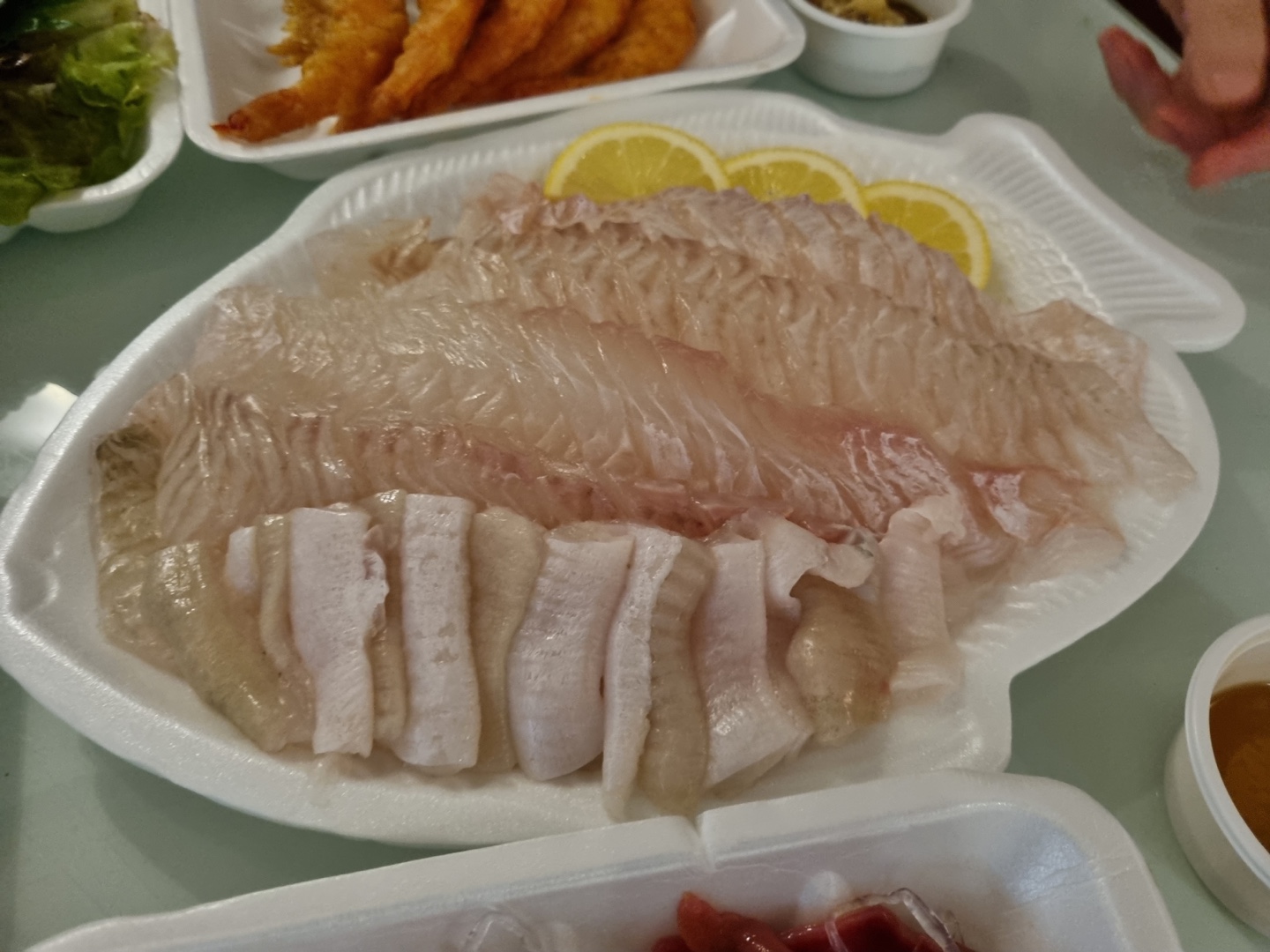 회 4만원짜리 크기가 작아보이실수 있지만 잘먹는 두명이 먹어도 부족함이 없을정도로 충분합니다. 새우튀김은 동막해수욕장 바로앞 새우튀김 집에서 6~7마리? 만원에 구매해서 아이주려고 같이 포장 했습니다. 사진에 포함된 새우튀김은 어판장에서 주신게 아닌 따로 구매한 음식 입니다.