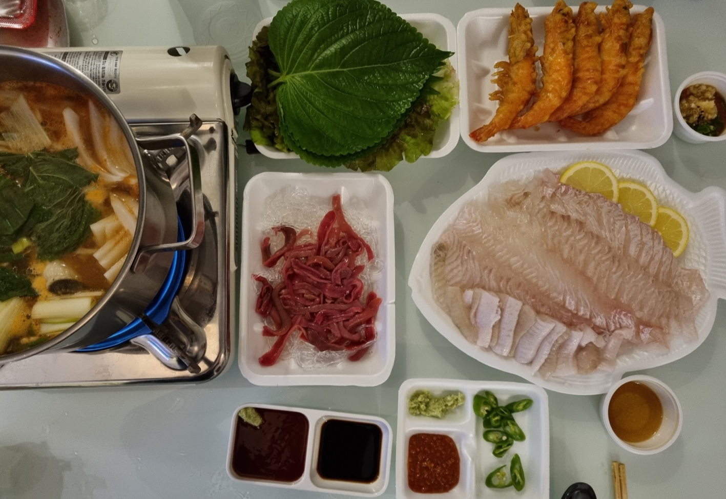 회 4만원짜리 크기가 작아보이실수 있지만 잘먹는 두명이 먹어도 부족함이 없을정도로 충분합니다. 새우튀김은 동막해수욕장 바로앞 새우튀김 집에서 6~7마리? 만원에 구매해서 아이주려고 같이 포장 했습니다. 사진에 포함된 새우튀김은 어판장에서 주신게 아닌 따로 구매한 음식 입니다.