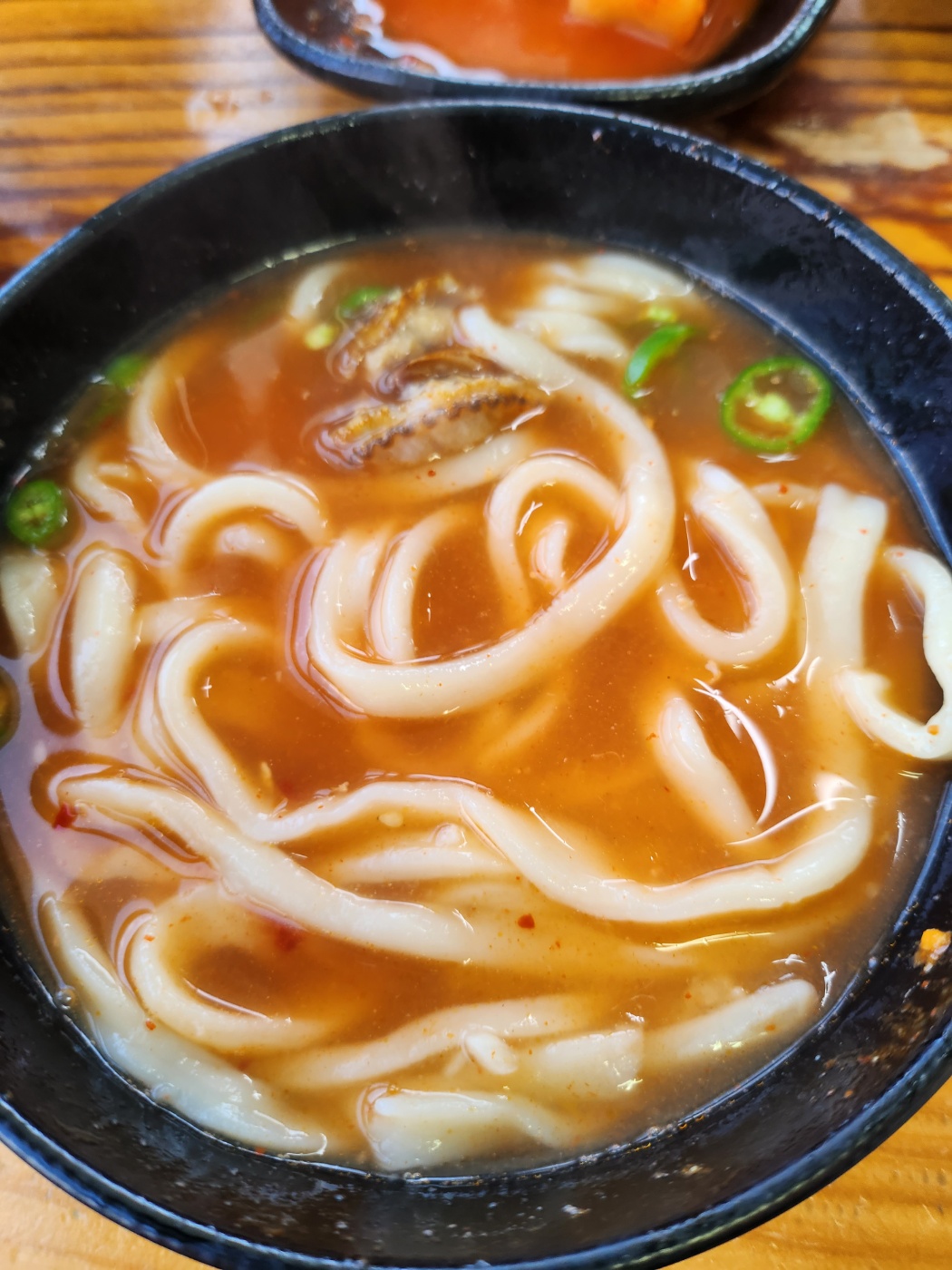 항상 최고인기인 해물칼국수와 보리비빔밥으로 시켰습니다. 보리비빔밥은 딱 맛볼수 있는정도로 적게 나오지만 입가심으로는 딱 좋습니다. 그리고 기다리던 해물칼국수! 가리비와 다양한 조개가 들어가 국물이 시원하고 일품입니다. 가리비 밑으로 작은 조개들이 있는게 아니라 꽤 큰조개들이 다양하게 있어서 배부르게 드실수 있습니다.