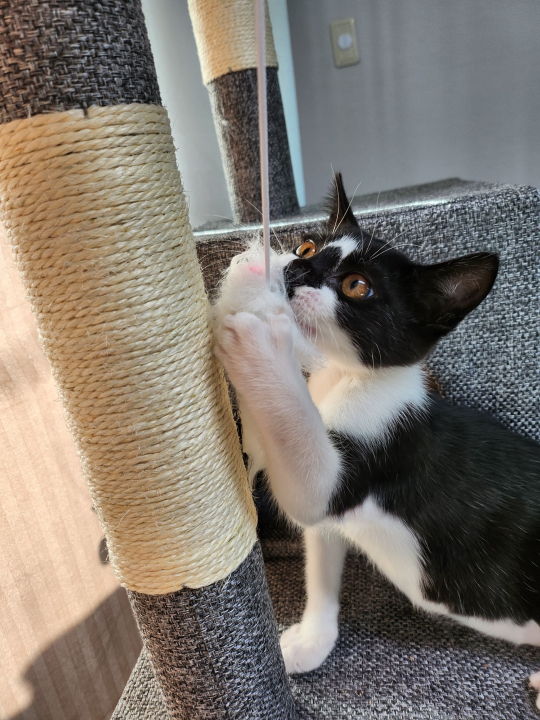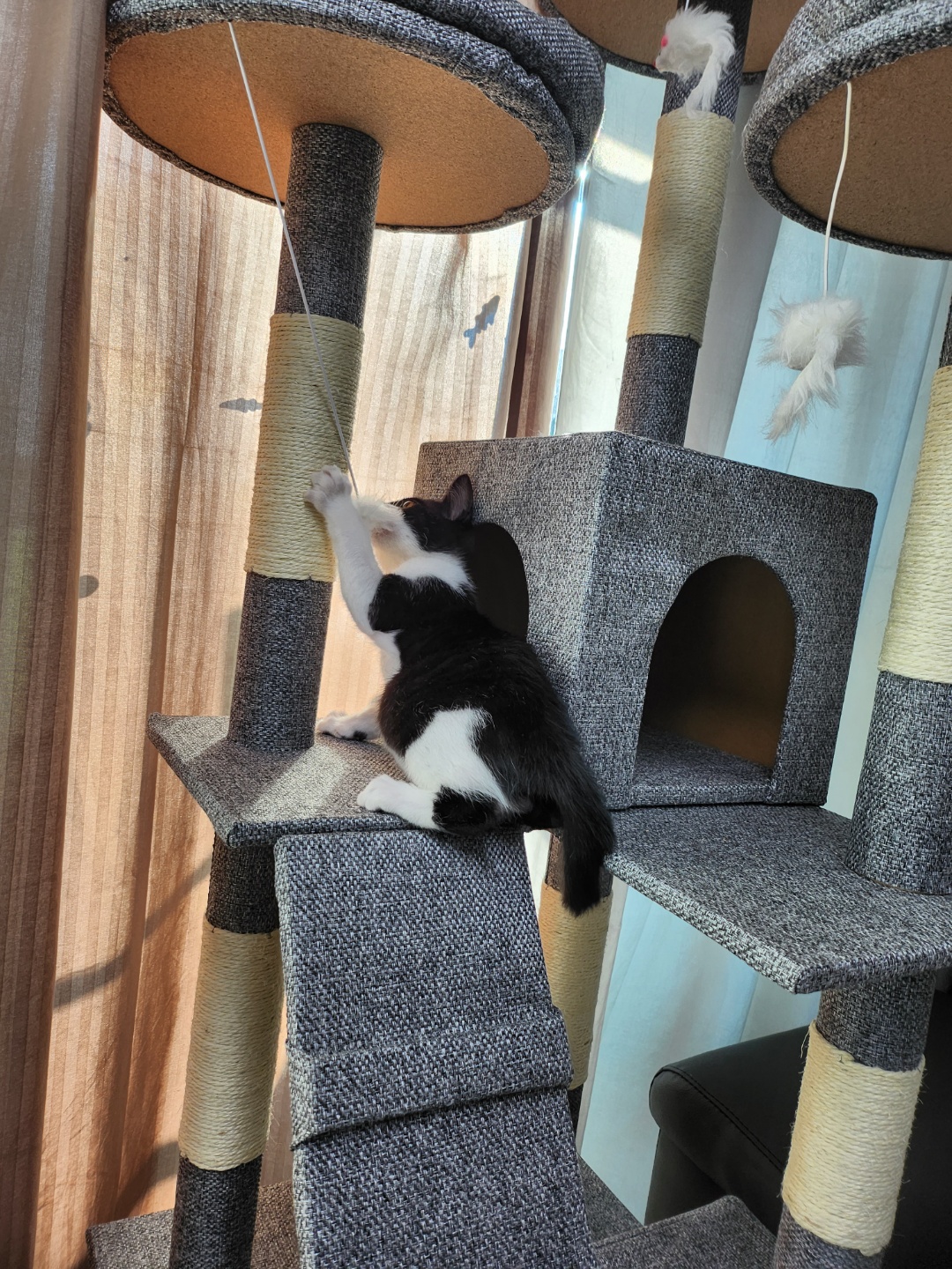 제일 윗쪽 쿠션에서도 잘자서 만족도 높게 잘 구매한거 같아 기분이 좋습니다. 저는 5만원안하는 다른 캣타워들도 봤지만 성체가 되면 아이가 심심할수도 있겠다 싶어 처음부터 놀게 많아보이는 헬로망치로 구매했습니다. 어른키보다 커서 오래 잘 사용할꺼 같습니다.