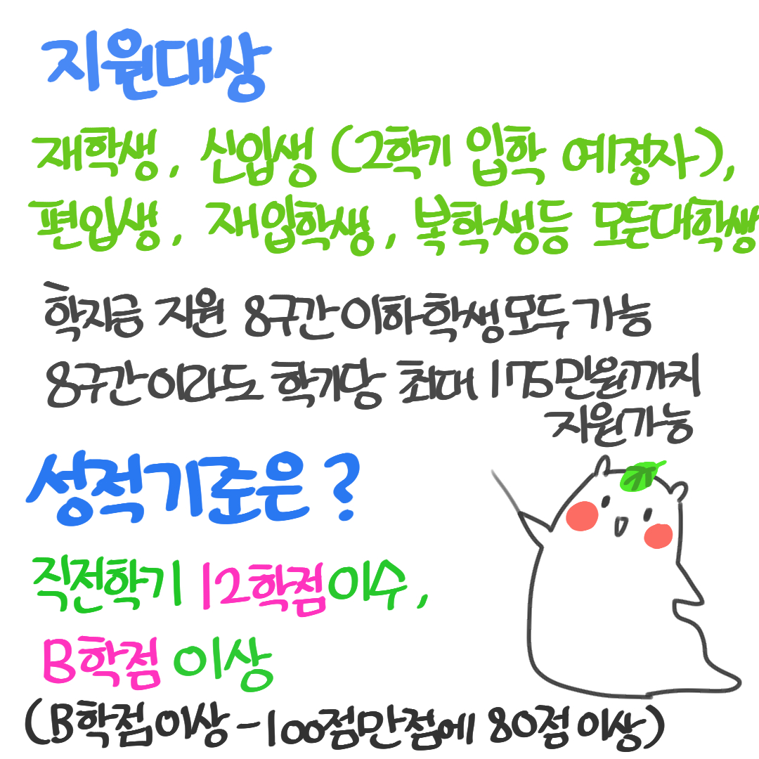 학자금 지원의 8구간 이하의 학생이라면 누구나 신청할 수 있습니다. 8구간이라도 실망하지 마세요! 8구간이라도 학기당 최대 175만 원까지는 지원받을 수 있기 때문에 속상해하지 마세요!