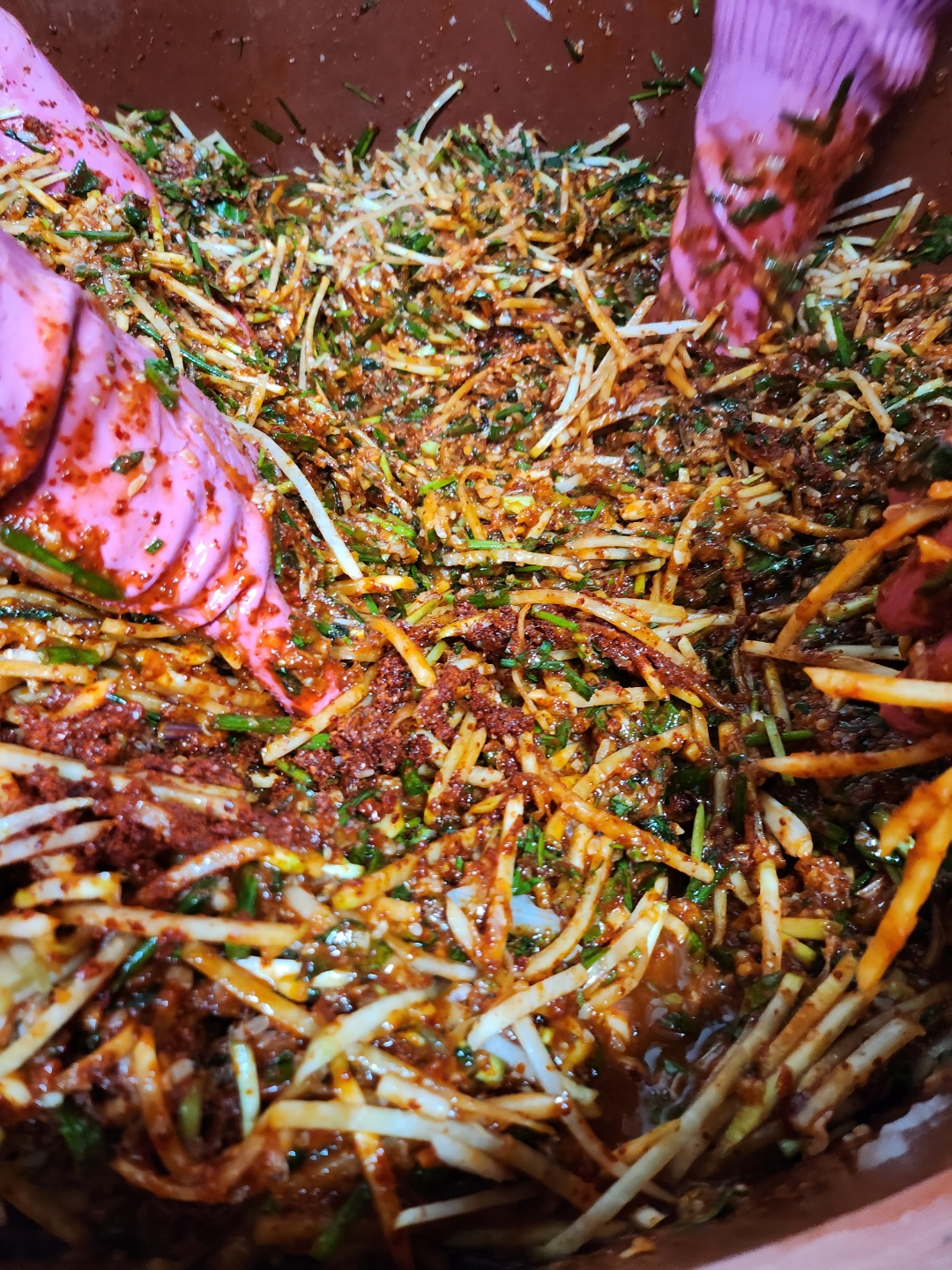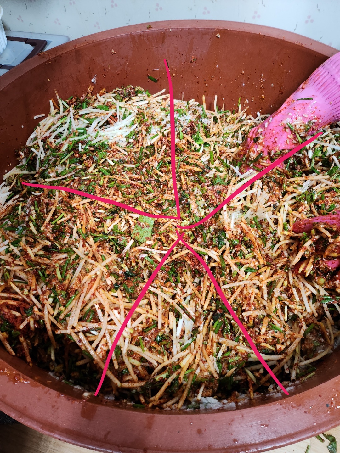김치 속을 만드시는 통의 크기를 보시고 5분의 1로 잡으시면 됩니다. 저희는 김치통큰거 가득 한통을 부어서 하기때문에 김장속 하시는 통 크기보시고 반찬통이나 바구니나 크기를 맞춰 개인이 만드는 양을 측정하시면 됩니다. 생새우로 하시는분들이 늘어나고 계시기도 하고 일단 알려드리는건 무조건 맞다는 아닙니다. 그냥 저희가 하는 방법을 알려드리는 것이기 때문에 참고하실 분들은 참고하시면 됩니다.