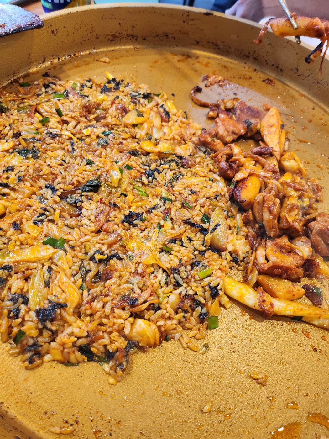 배불러서 볶음밥을 먹을까 말까 고민하다가 먹었는데 한입먹는다는게 다먹게 되는 맛이였습니다. 닭갈비와 닭내장볶음을 먹을때 치즈를 먹었기 때문에 볶음밥은 치즈를 하지 않았는데 역시나 치즈 안하고 먹길 잘한게 볶음밥 특유의 맛을 살려서 느낄수있고 치즈를 또 먹으면 물려버리거나 느끼할꺼 같아 주문하지 않고 볶음밥만 했습니다.