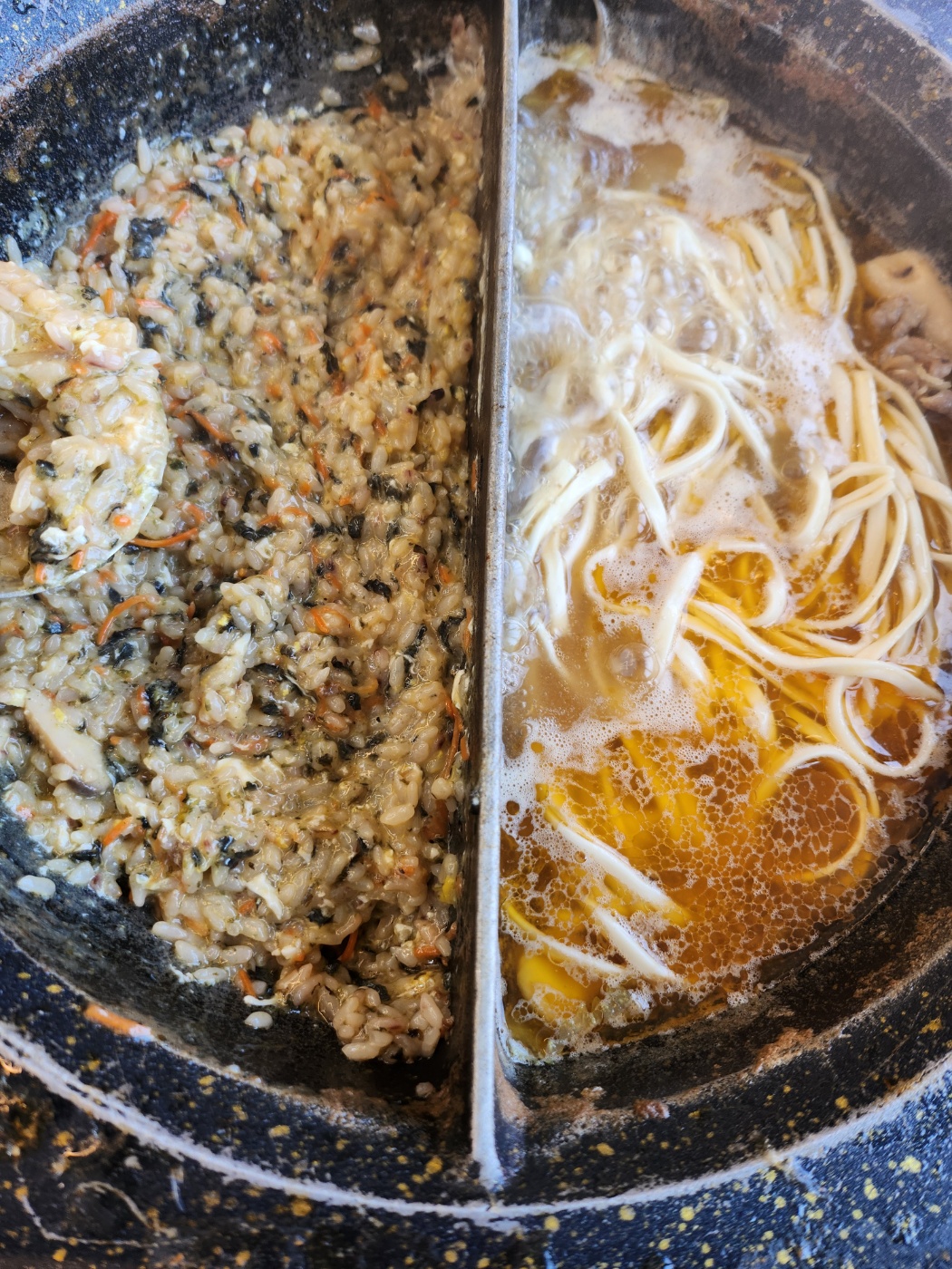 샤브샤브가 반으로 다른맛을 즐길수 있는것처럼 다먹고 난 뒤에는 죽과 칼국수를 만들어 드실수 있습니다. 죽은 밥과 김가루, 참기름을 뿌리고 계란을 챙깁니다. 당근을 가위로 잘게 잘라서 넣어주어도 좋습니다. 아이랑 같이드신다면 안매운육수에 죽을 하시는걸 추천드립니다. 칼국수는 칼칼한 국물에 더욱 잘어울렸습니다. 꼭 두가지 다 드셔보세요! 정말맛있습니다!