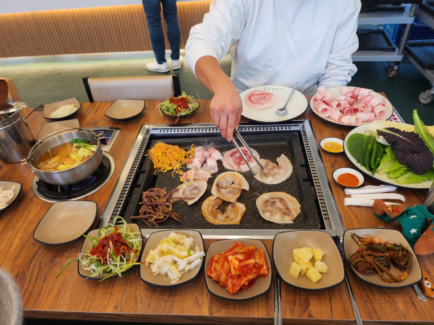 기본적으로 샤브샤브같은 칼국수냄비가 고기를 주문하면서 나옵니다. 그 외에는 셀프바를 이용하셔서 상을 꾸며주시면 되는데 제가 꼭 추천드리는건 고사리,콩나물,김치는 꼭 같이 고기랑 구워먹어야 꿀맛이라는점! 특히 고사리 꼭 구워드세요. 정말 맛있습니다.