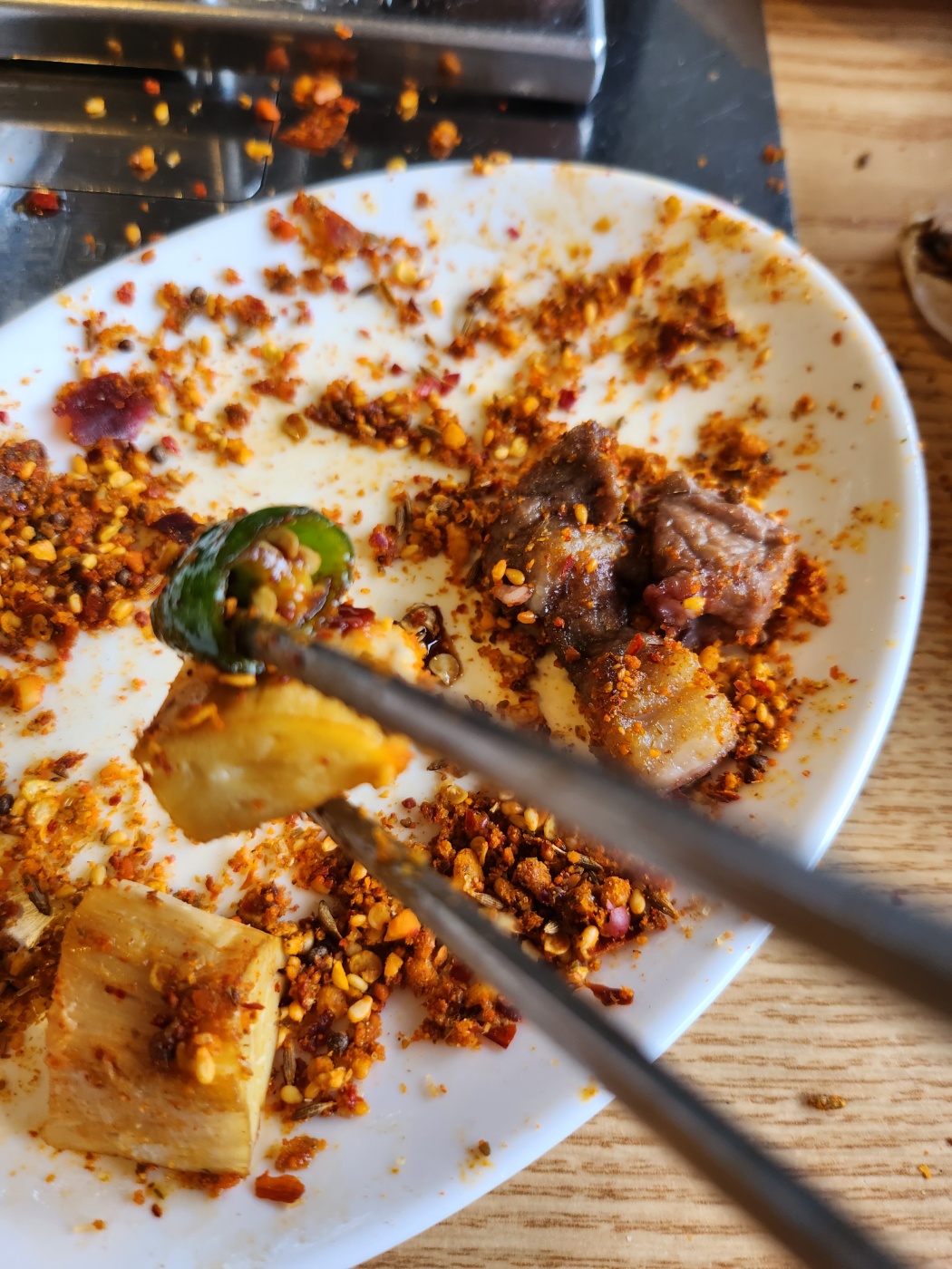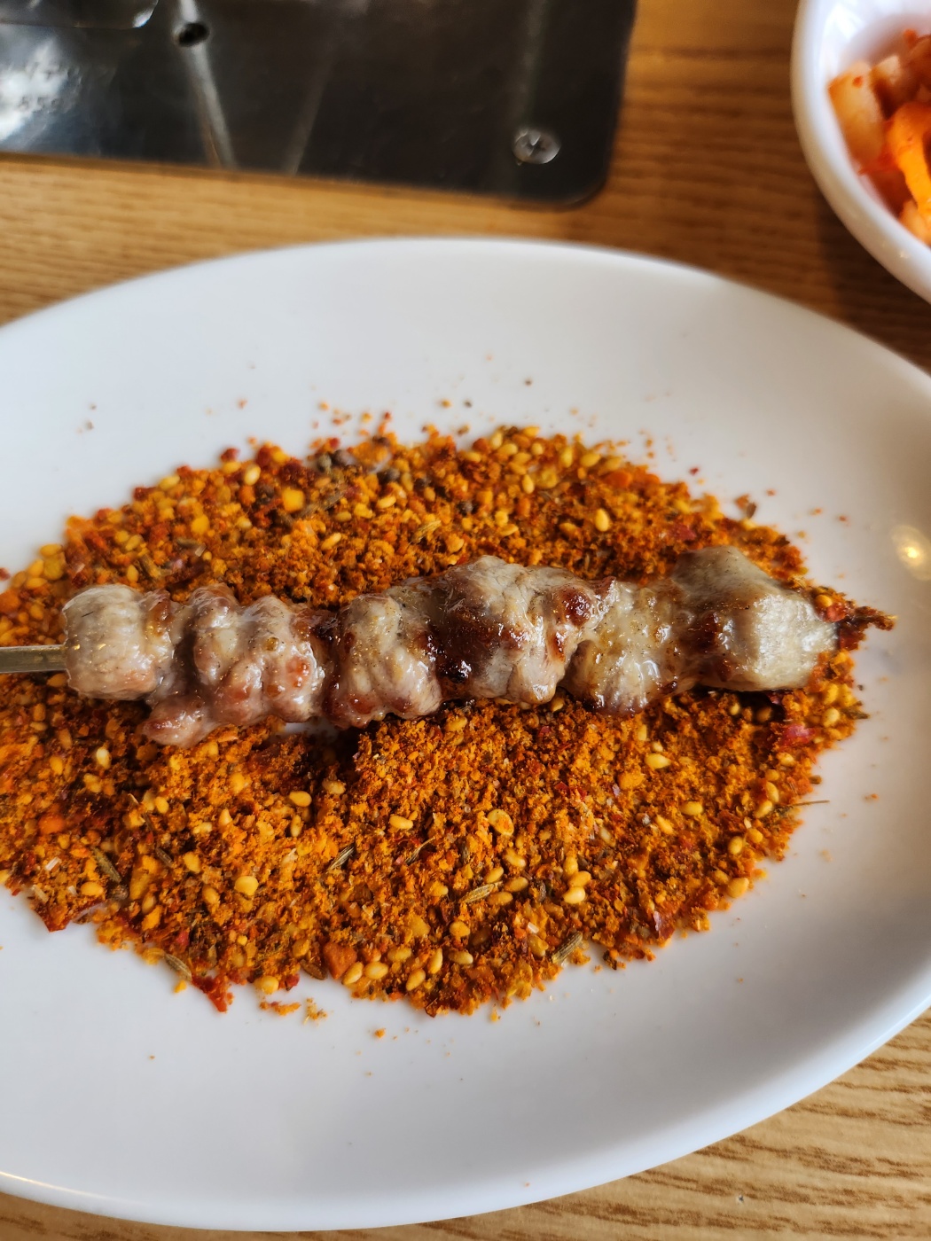 양꼬치가 익어서 한입 먹었는데 엇!하고 정말 놀랐던게 너무 쫄깃하고 맛있어서 당황했습니다. 큐민에서 먹고온게 어끄제 같은데 큐민과는 또 완전 다른맛! 기본반찬도 너무 맛있고 일단 양꼬치 맛에서 계속 감탄을 하게돼서 생양꼬치에 뿌려진 특별한소스때문일까 아니면 아침에 바로 썰어서 준비하는 양꼬치라서일까 많은생각과 맥주를 달렸습니다.(빠지지않는 술)