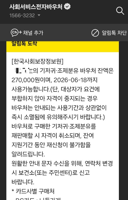 기저귀,조제분유 바우처는 받을 수 있는 기준이 있어 신청해 주시는 분이 복지과에 들렀다 가보세요~하시면서 안내를 해주십니다. 만약 받으면 좋지만 안 받아도 다자녀인지 급여기준이라던지로 나눠지는 거라서 서운해하지는 마세요~저희는 다자녀라서 3개월치 27만원을 신청한 날 다음날 바로 들어왔습니다. 알림은 카톡으로 왔습니다.