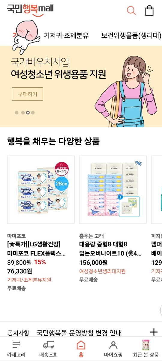 카드사마다 사용할 수 있는 곳이 있으며 저희는 신한카드 국민행복카드라서 국민행복몰에서 구매가능했습니다. 위 메뉴에 있는 기저귀, 조제분유 메뉴에서만 고를 수 있으며 검색해서는 고르는 물건은 안 되는 물건도 있어 잘 골라서 구매하셔야 저렇게 본인부담금 0원으로 표시됩니다. 만약 본인부담금이 뜨면 빼야 할 품목이 있는 거라 잘 확인하시고 구매하시면 됩니다. 미리 카드등록 후 사용가능합니다.