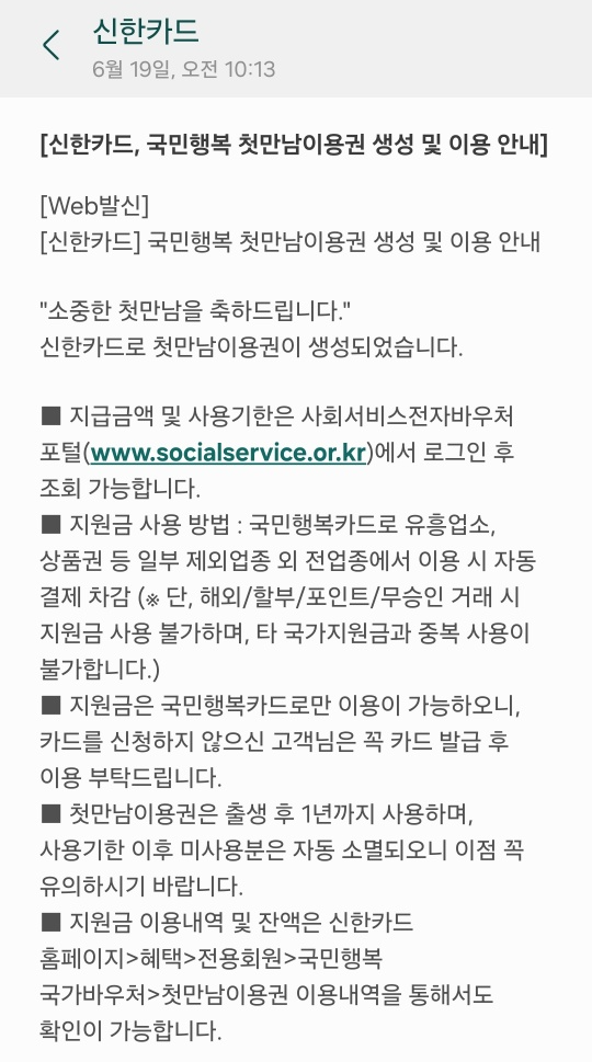 첫 만남이용권은 임신바우처처럼 국민행복카드로 지급됩니다. 신청하고 나서 다음날 바로 들어왔으며 첫 만남이용권이 생성되었습니다~문자가 오면 바로 사용하시면 됩니다. 사용하면 바로 잔액이 얼마 남았다고 문자가 오기 시작하기 때문에 사용하기 전까지는 따로 잔액확인은 어렵습니다. 바우처라고 얘기 안 하셔도 되며 그냥 말없이 사용하셔도 됩니다. 첫쨰는 200만 원 둘째는 300만 원 지급됩니다.