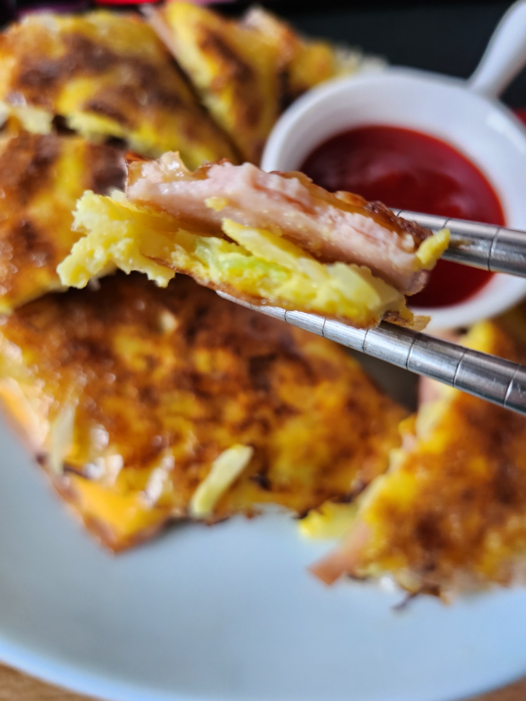 반으로 접어서 만드셔도되고 아니면 원형모양으로 만드셔도 상관없습니다. 그리고 안에는 치즈나 햄을 취향대로 넣어주신다음 반으로 접어주시면 됩니다. 치즈가 한장에 50칼로리라고 적혀있었습니다. 그래도 일반밥을 챙겨먹는것보다는 칼로리가 적다고 생각했습니다. 저는 주로 치즈를 넣어먹고 더 맛있게 먹고싶은 날은 햄을 추가했습니다.