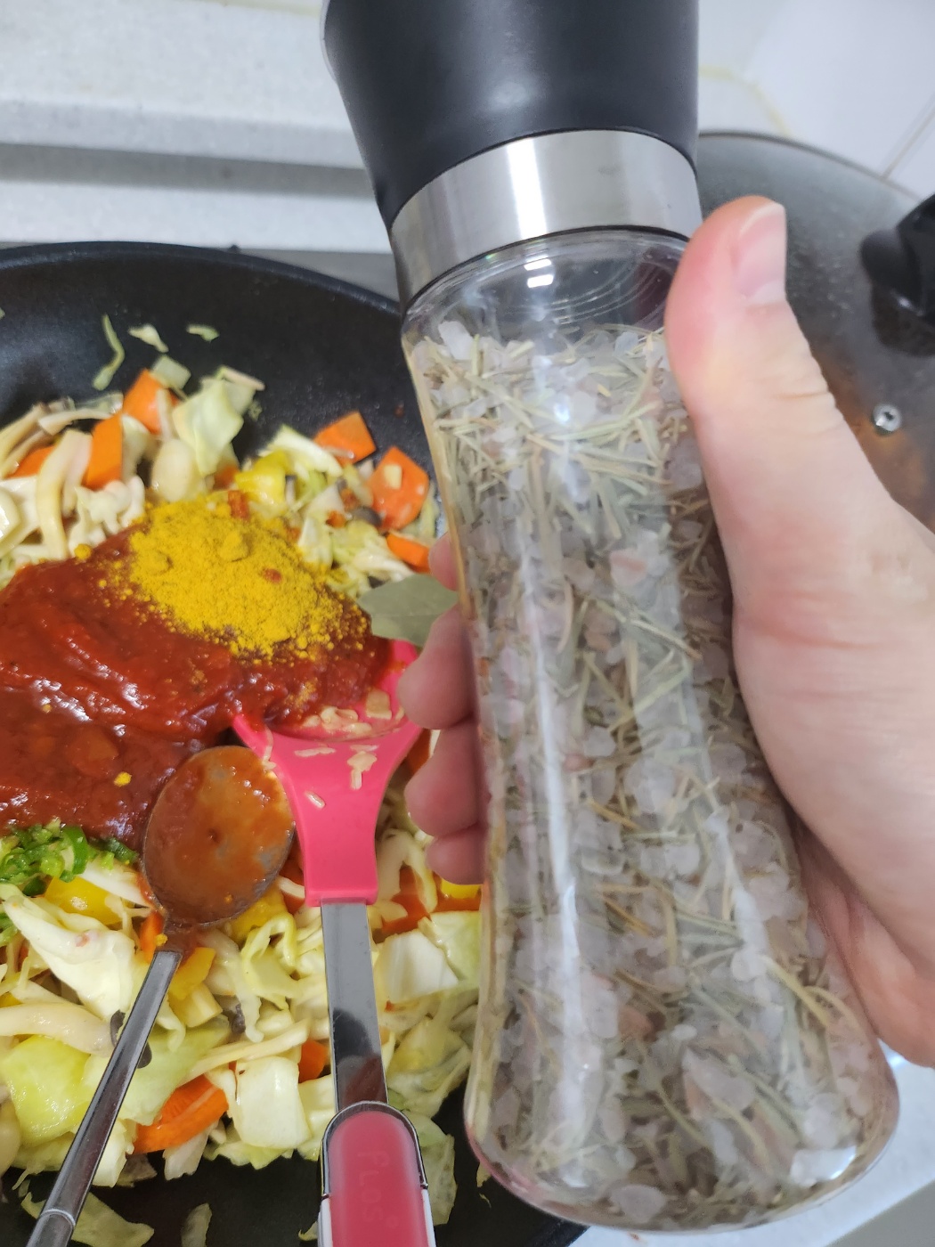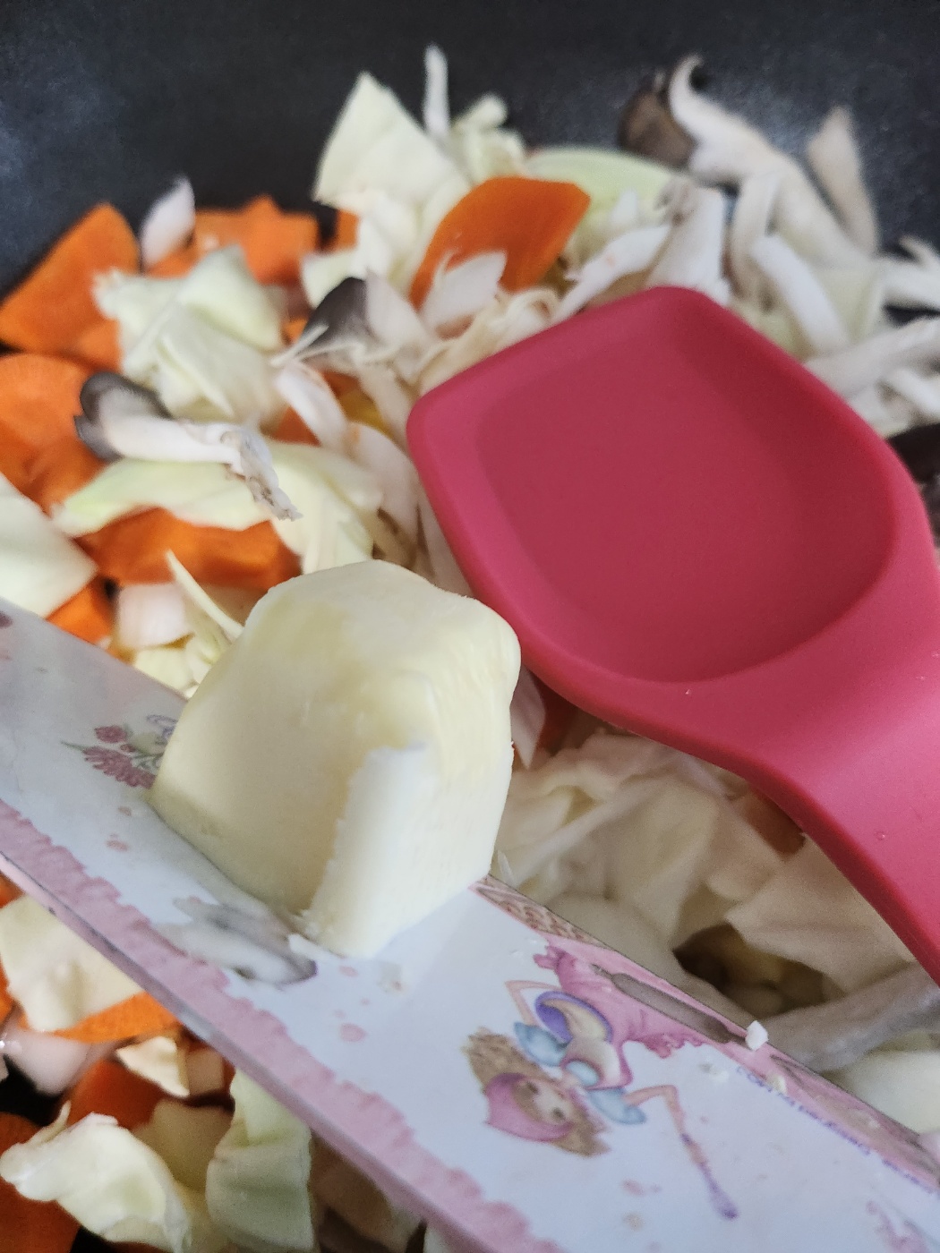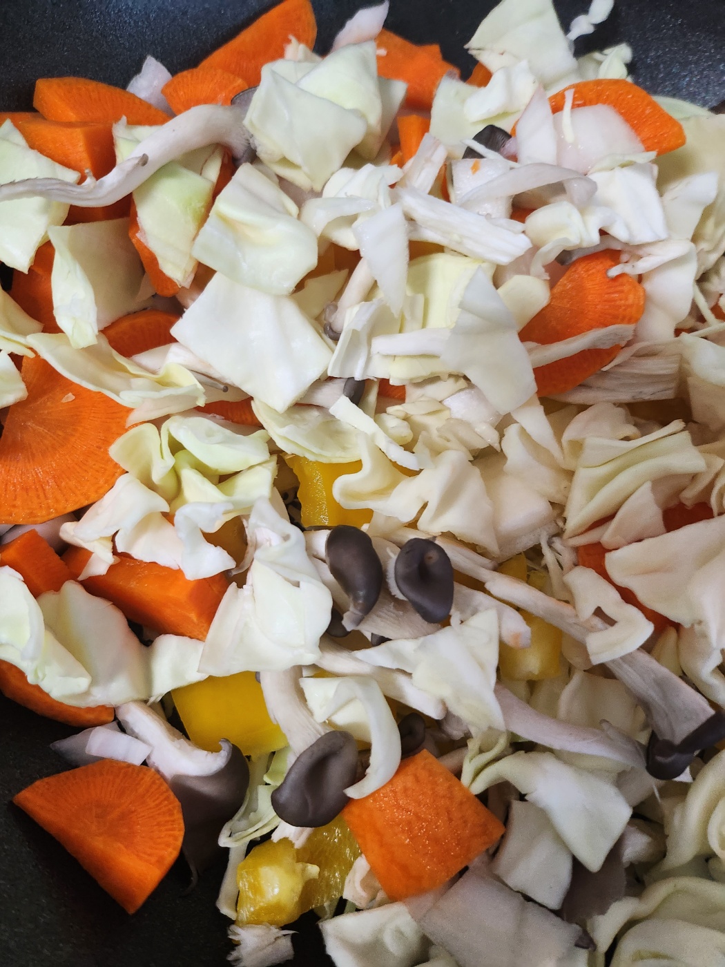 토마토(저처럼 토마토없으면 스파게티소스로도 가능), 양배추, 양파, 양송이버섯(다른버섯도 가능),마늘 편썰은거, 당근 등 다른 취향의 본인이 좋아하는 야채 썰어넣고 올리브유나 버터 둘중에 하나를 넣고 볶아서 야채를 살짝 숨죽듯 타지않게 잘 섞어가면 볶아줍니다.
