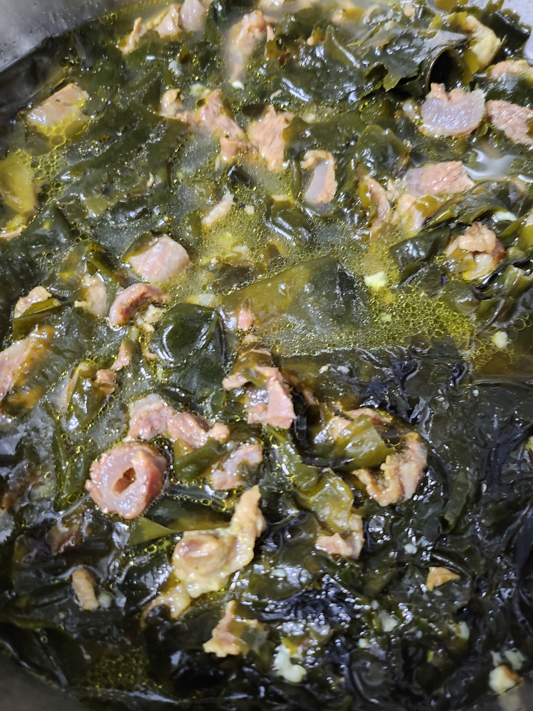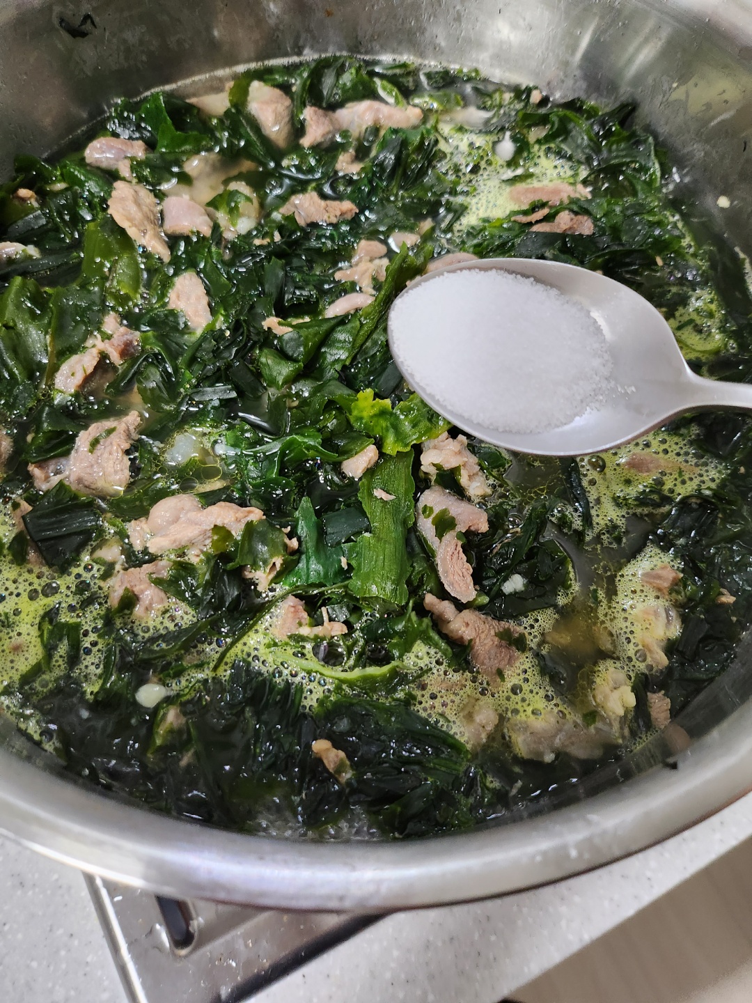 물을 넣고 소금 반숟가락을 바로 넣고 뚜껑을 닫아 한참을 끓여줍니다. 그렇게 끓이고 나면 감칠맛도 나고 맛있는 추억의 미역국 맛이 나게 됩니다. 이렇게 끓이면 어른들은 싫어하시는분은 없었습니다. 조금 짜다고 생각하시는 분들 물컵 한잔정도 물을 넣어보세요 감쪽같이 간이 적당해집니다.