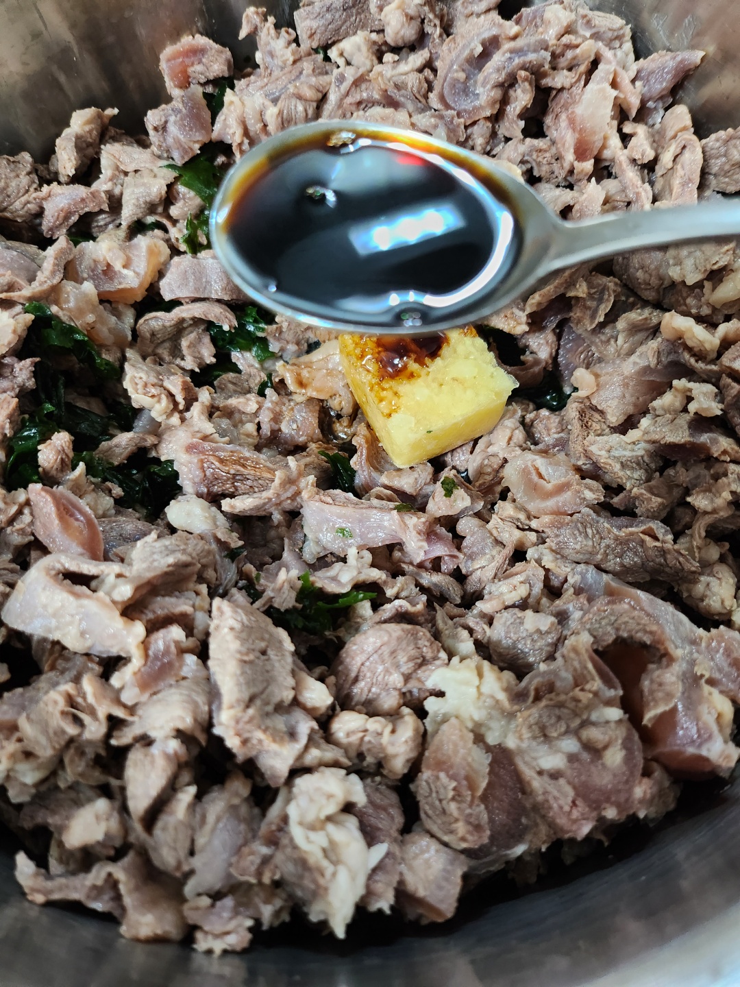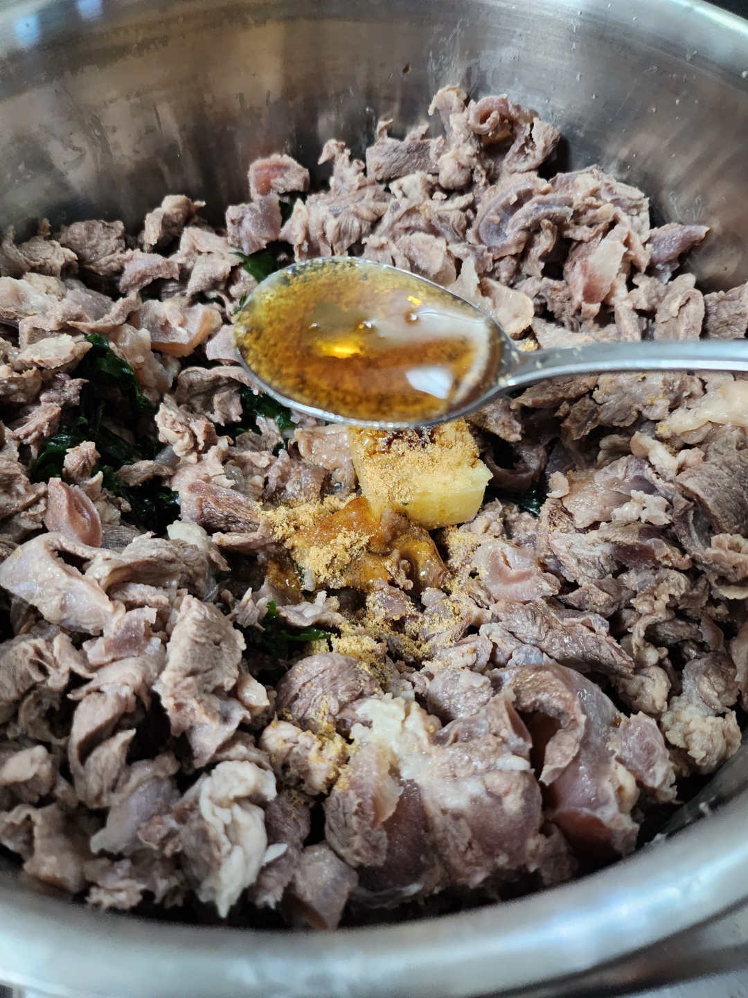 고기는 먹기좋은 크기로 잘라주시고 다진마늘 한숟가락, 국간장 두숟가락, 쇠고기다시다 한숟가락을 넣어주세요.