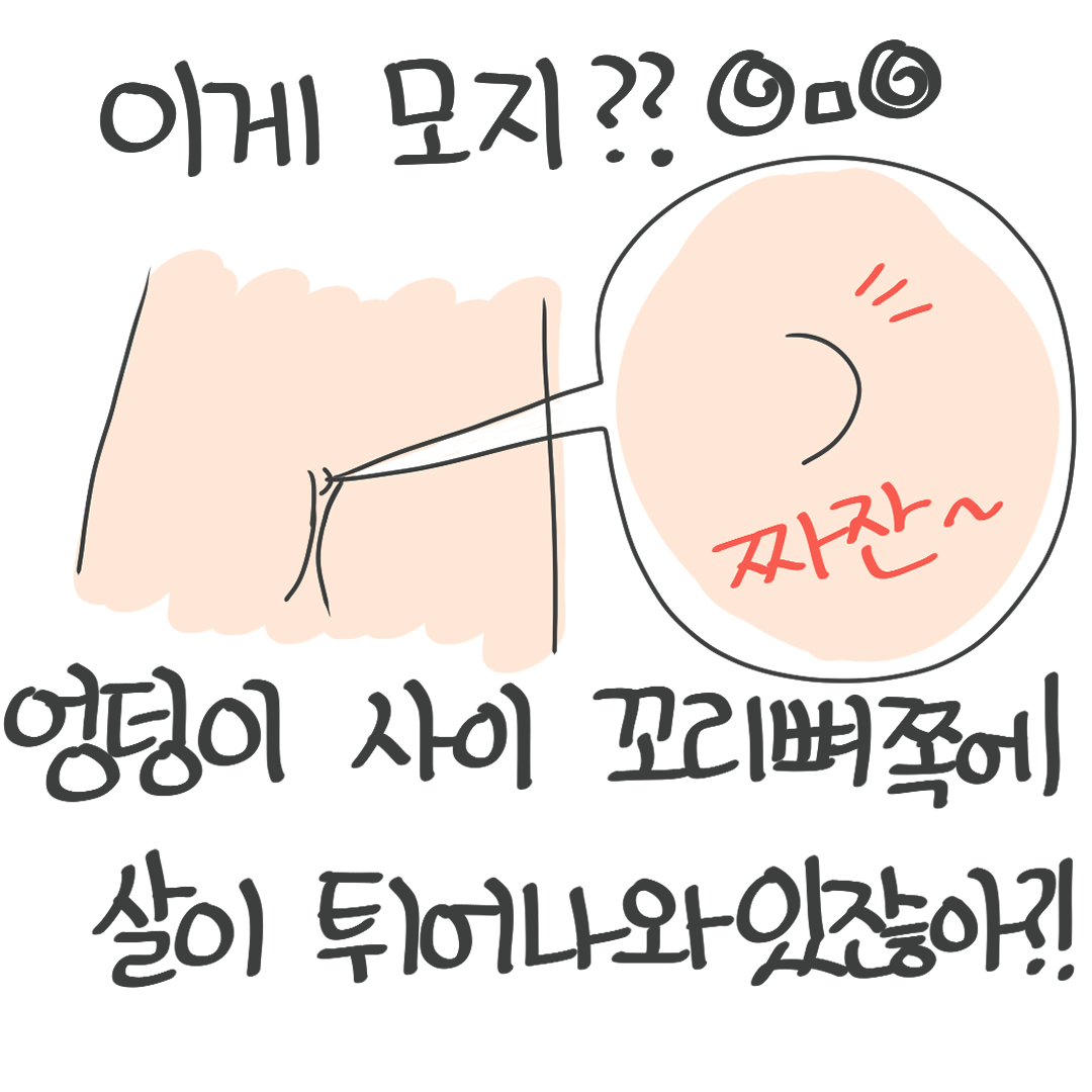 그러다 문득 보게 된 엉덩이 사이에 튀어나온 살 처음엔 이상하게 주름 진건가 했지만 살이 볼록하게 튀어나온 거였습니다. 보자마자 아기에게 안 좋은 거 일까 봐 걱정만 되고 무서웠습니다. 잘 몰라서 피부 종양이라던가 많은 상상을 해버렸기 때문에 무서울 수밖에 없었습니다.