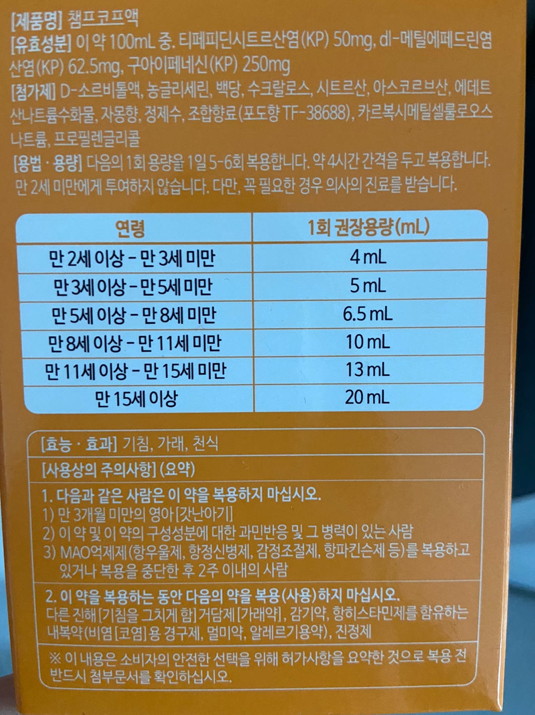 병원약을 다먹어서 더 받으러 가지 않고 기침,가래가 심한날은 챔프코프를 먹였습니다. 하루 5~6회 복용하라고 되어있지만 그냥 아침, 점심, 저녁에 먹였고 맛은 설탕물처럼 엄청 단 시럽맛이여서 쓴맛보다는 나았습니다.