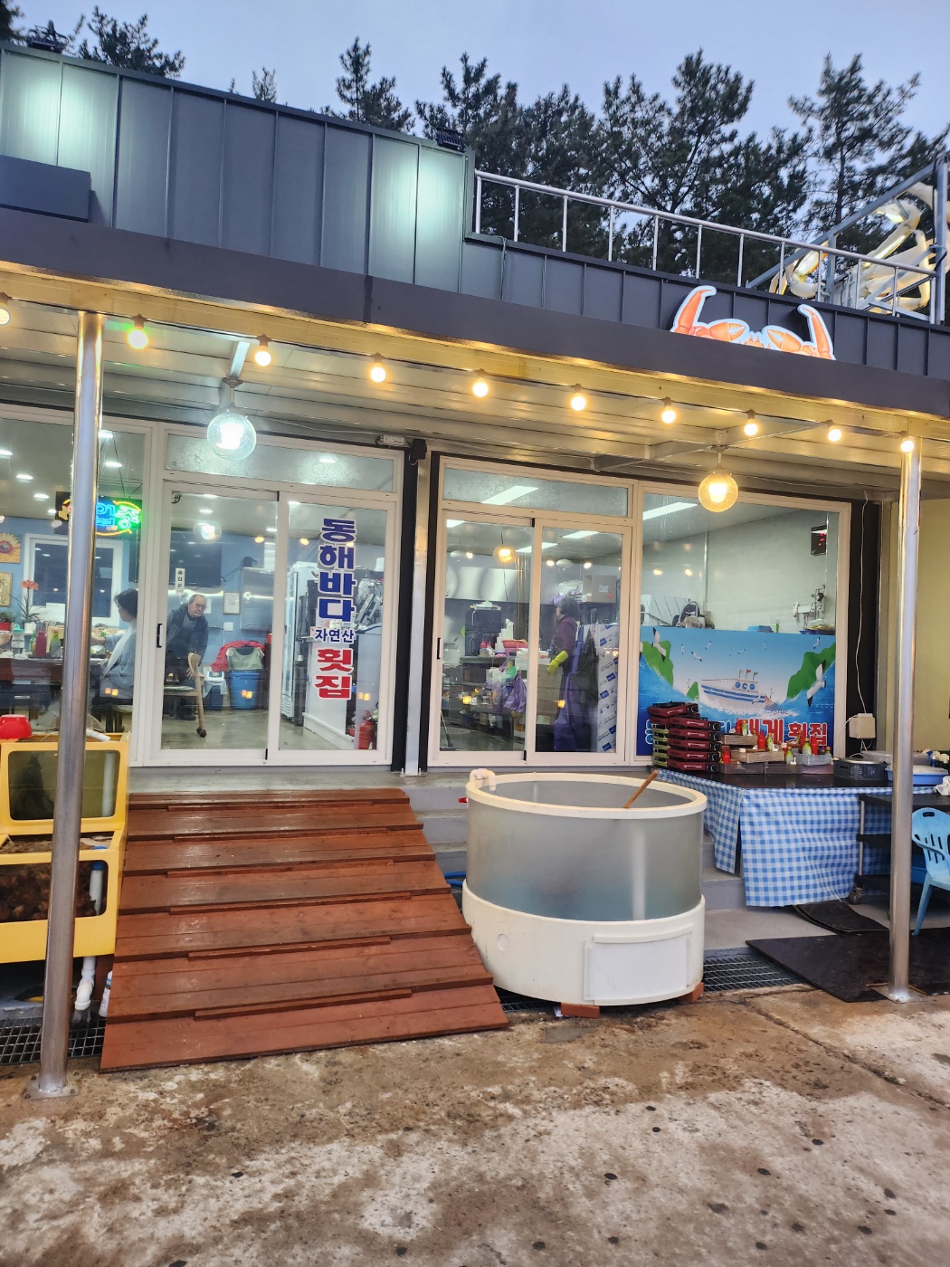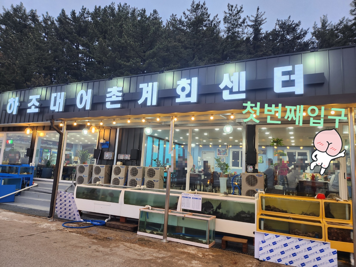 노상으로 먹어도 분위기 감성맛집인 하조대 어촌계회센터 입니다. 이번에 가니 리모델링해서 전보다 훨씬 멋있게 바꼈습니다. 외부도 내부도 깔끔하게 바꾸셔서 편하고 좋았던거 같습니다. 입구는 첫번째 두번째 나눠져 있지만 저희는 첫번째 입구로 항상 먹는다는점! 건물은 하나지만 반씩 나눠져 있는 구조입니다.