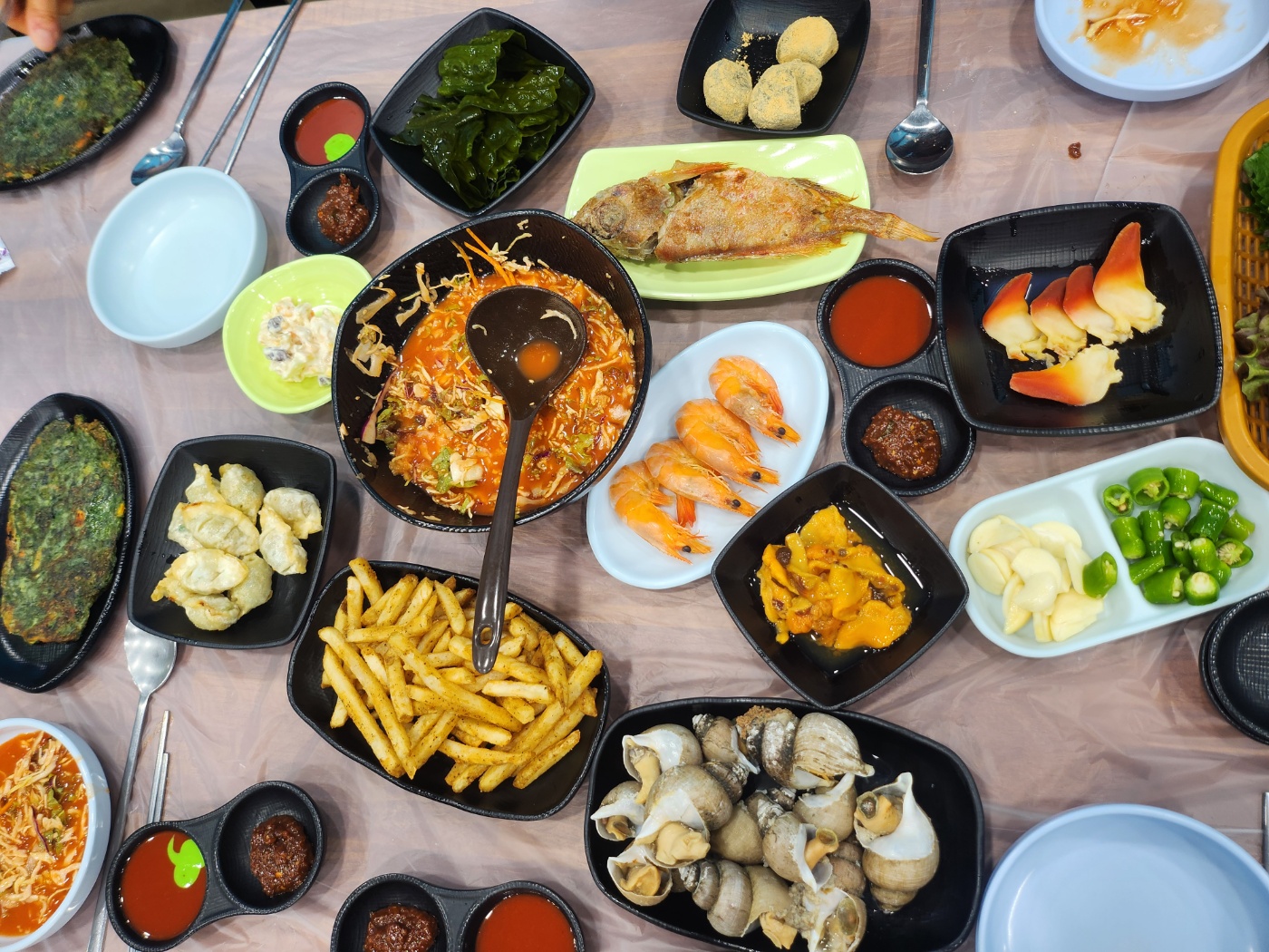 맛있게 회와 먹다보니 대게도 나왔습니다. 사진으로 봤을때는 적어보이시나요? 절대 아니예요! 대게다리들 위로 몸통살이 쌓여있습니다. 4명이서도 충분히 적지않게 만족스럽게 먹을수 있습니다. 살을 쉽게 발라먹을수 있게 손질해주셔서 먹을때도 편하고 딱지장은 볶음밥 말씀드려서 다시 가져가셔서 볶음밥으로 만들어 주셨습니다.