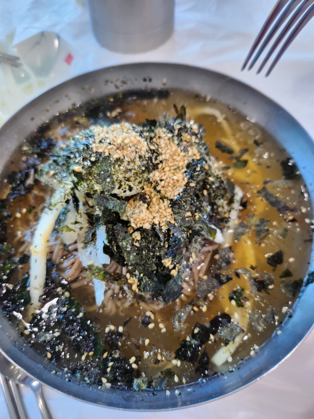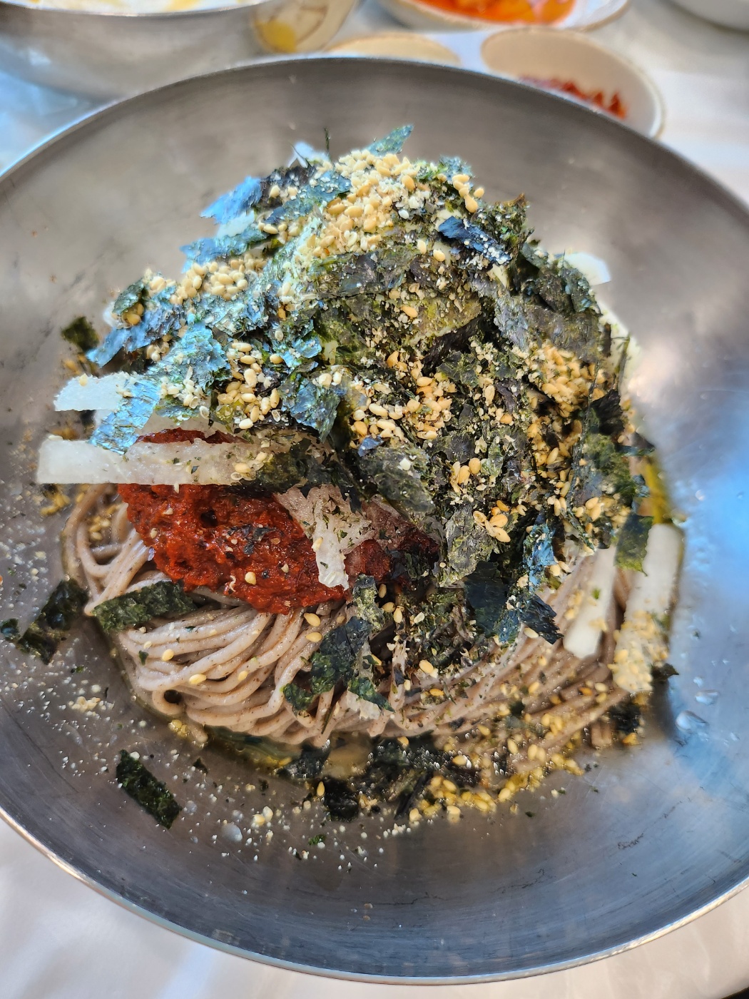 70세 어르신 입맛에 장칼국수가 감탄나올정도면 아주 괜찮다는점! 저도 한입 먹어보니 양념과 째복의 시원함이 잘 어우러져서 좋았습니다. 저는 비빔막국수를 시켰는데 비빔막국수가 너무 제 취향이였습니다. 저는 비빔을 대부분 좋아해서 자주먹는데 여긴 또 여기만의 매력이 있더라구요, 양념이 모랄까 중독성있는 감칠맛이 나서 배부른데도 다 먹었습니다! 같이주신 육수도 아주 시원해서 좋았습니다.