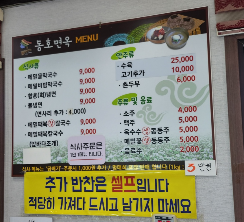 동호해변 바로앞 길건너 골목에 있는 동호면옥! 주차장도 건물 앞뒤로 있어서 주차가 불편하지는 않았고 오래된듯한 건물이였는데 들어가니깐 밖에서 봤을때보다 내부가 커서 놀랐습니다. 자리가 적을꺼 같았는데 테이블이 안쪽에도 있어서 꽤 많은 인원이 들어와서 식사를 하실수 있어요! 메뉴도 다양하고 가격도 요즘 물가에 비해서는 적당하다고 생각이 들었습니다.
