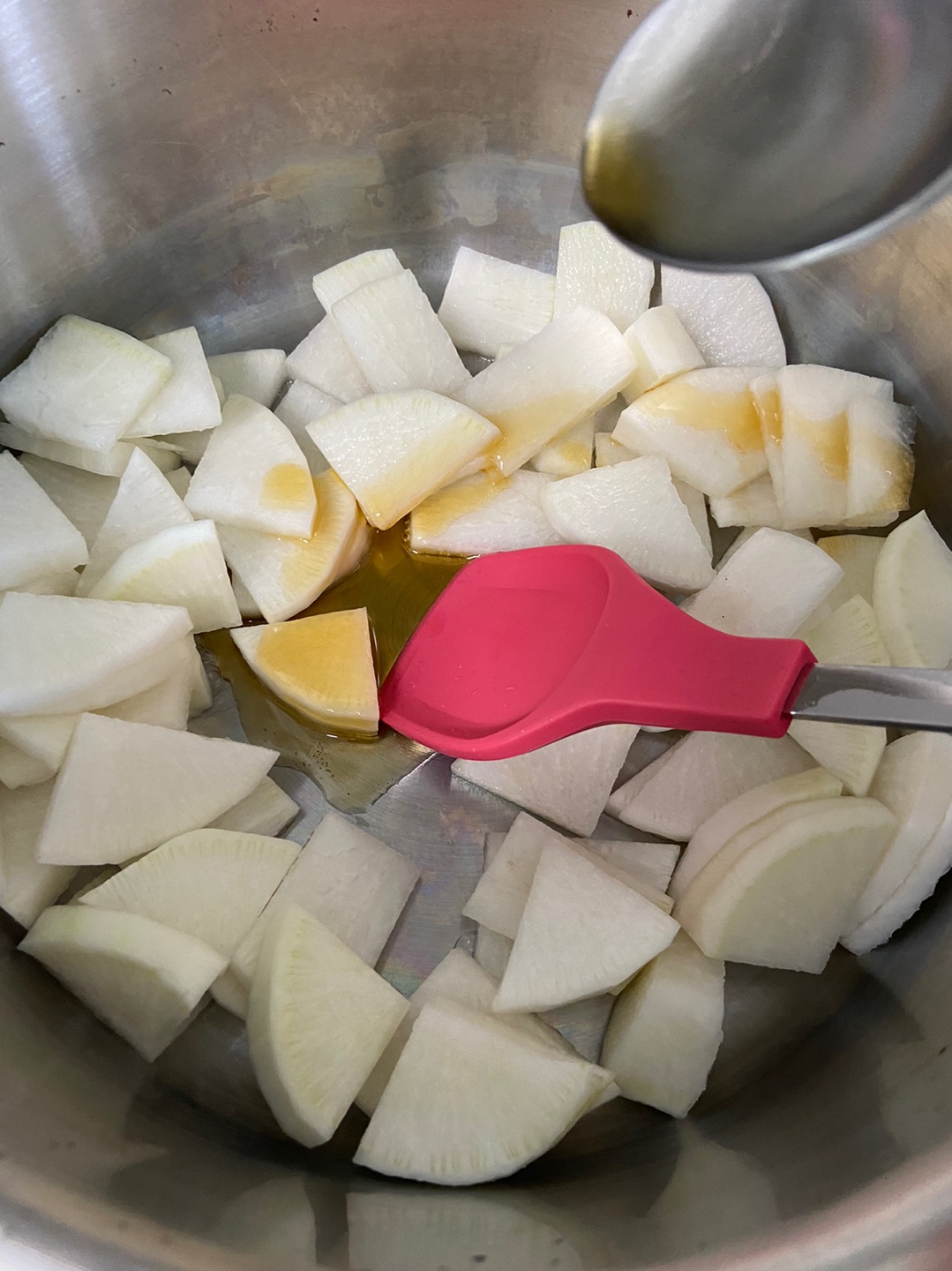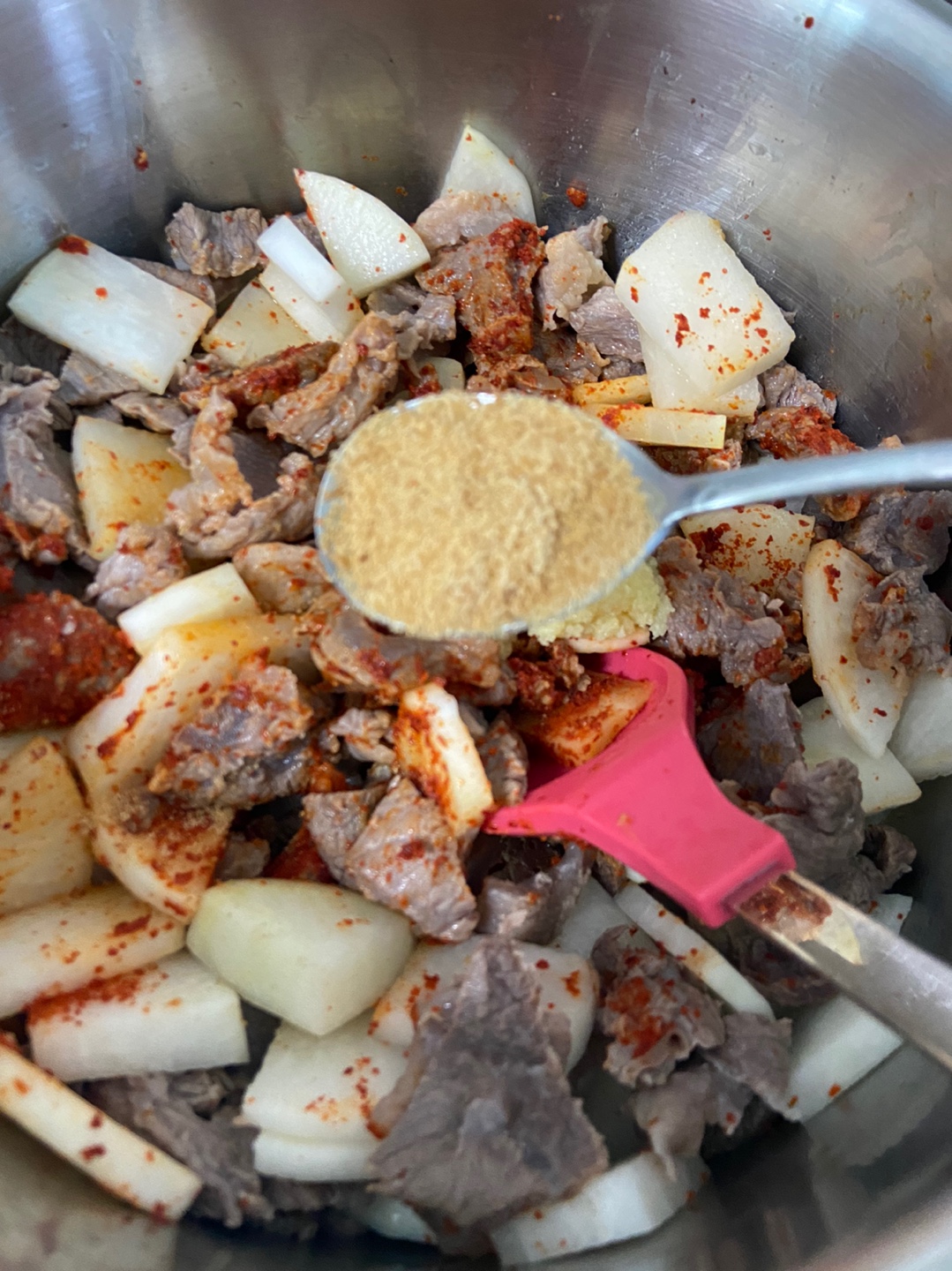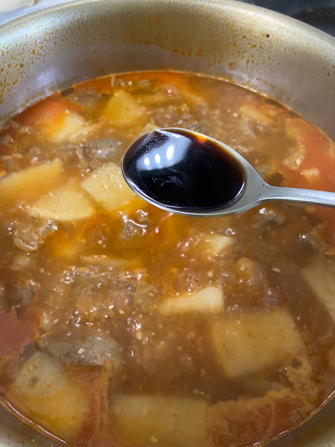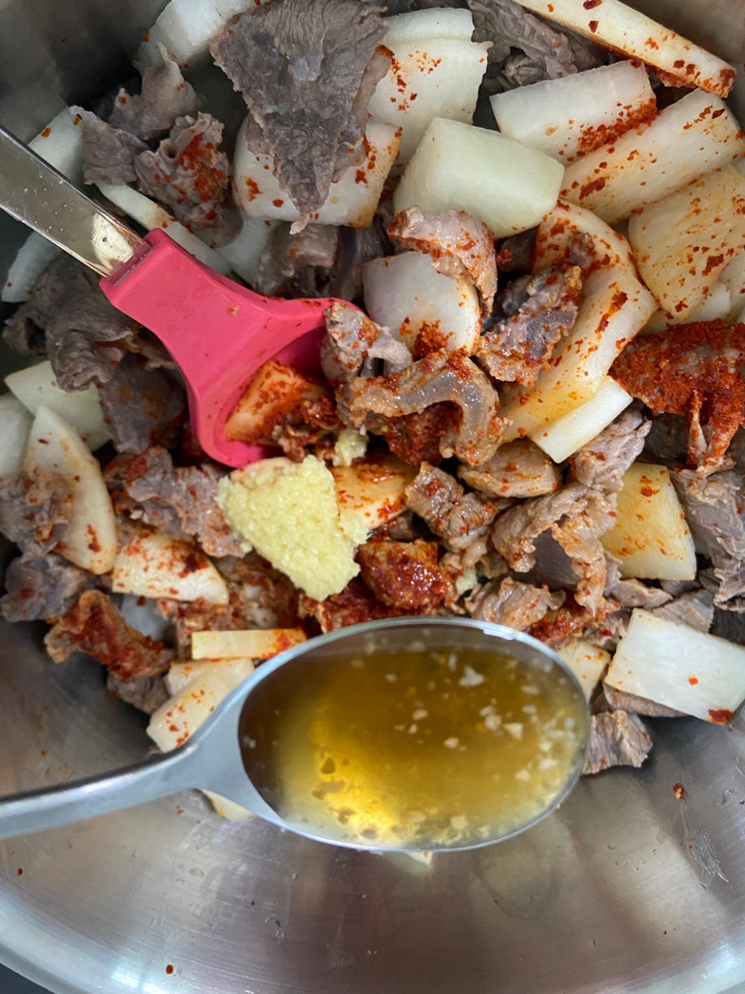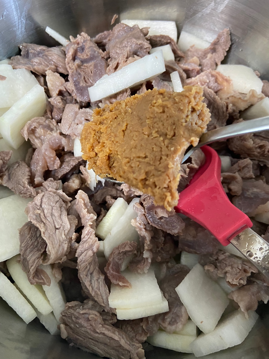 무가 어느정도 익었다 싶을때 쇠고기다시다 반숟가락, 국간장 2숟가락, 액젓 한숟가락을 넣어줍니다. 자극적인 한국맛 좋아하시는분들은 취향에 맞게 여기서 더 넣어주시면 됩니다.