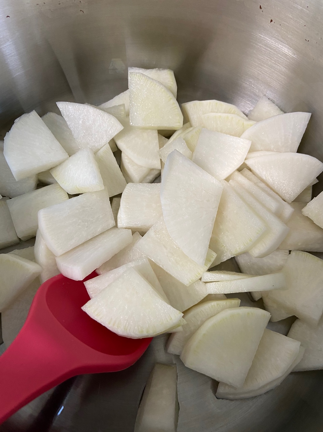 무를 썰어서 넣어주신다음 익힌스지를 넣어주세요. 참기름 2 숟가락, 된장 한숟가락반, 다지마늘 한숟가락, 멸치액젓 한숟가락, 쇠고기다시다 한숟가락, 고춧가루 한숟가락 을 넣어서 볶아줍니다. 무가 쌀짝만 익을정도여도 상관없습니다. 5분정도 볶아주시고 물을 2리터 넣어주세요.