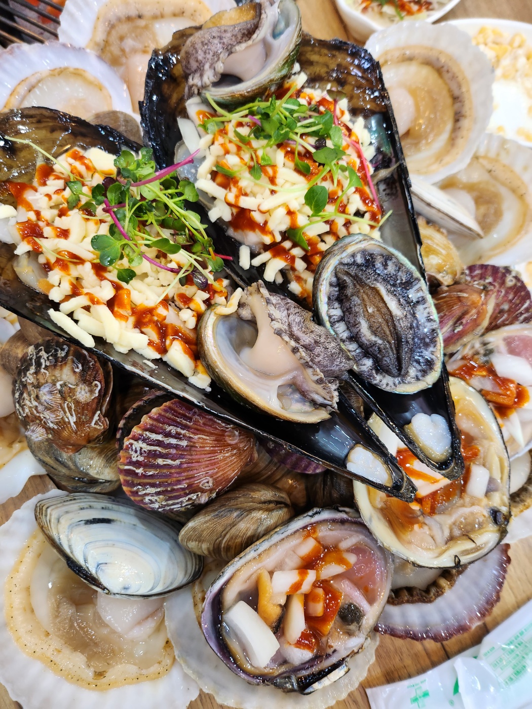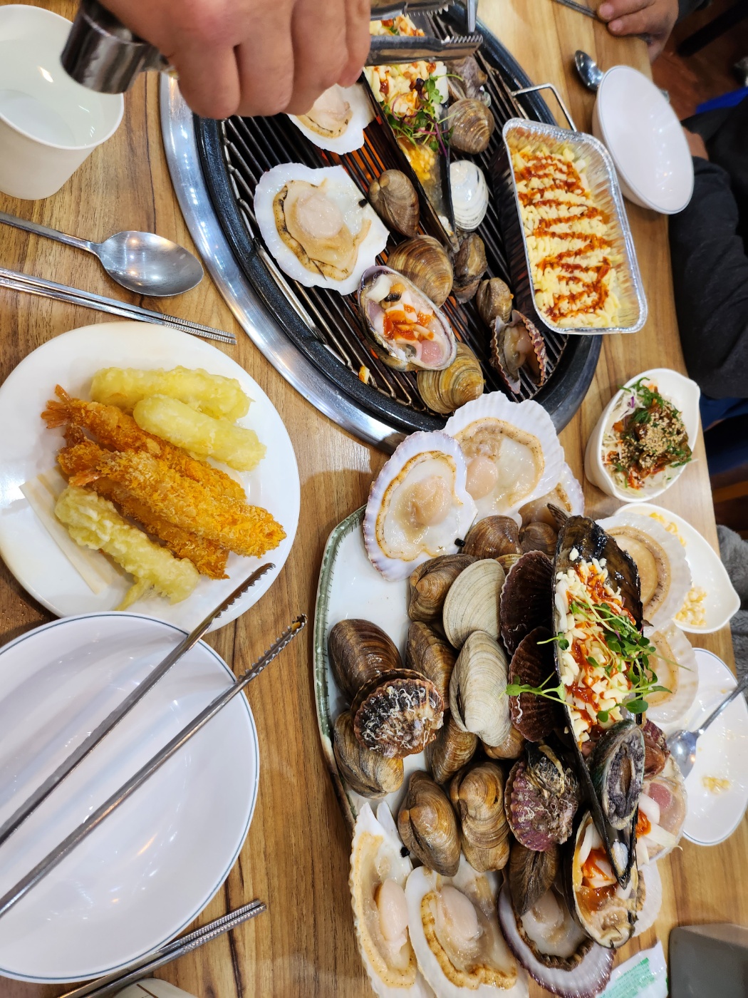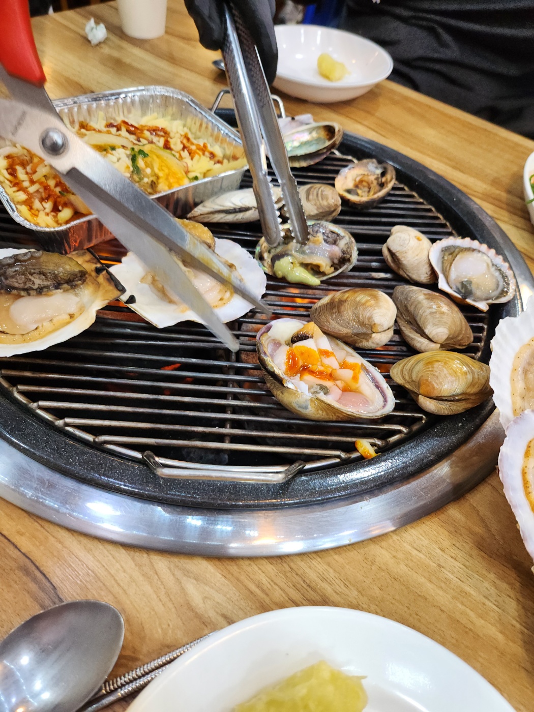 정말 사람이 많은데도 쉬지않고 돌아다니시면서 상을 봐주시고 조개가 타지않게 관리도 해주십니다. 어떻게 먹으면 더욱 맛있게 먹을수 있는지 알려주시고 먼저 먹는순서라던가 조개를 오래구우면 껍질이 튀어서 위험할수있다고 조언도 해주셨습니다. 여기는 치즈도 리필이 가능하다는점!특히 우동볶이에 조개넣고 먹으면 최고입니다.