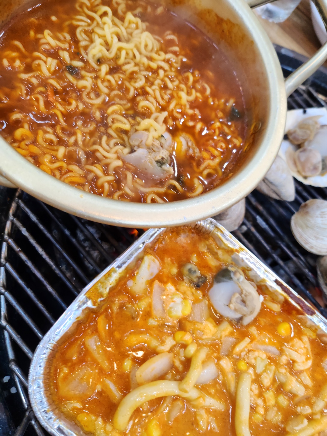 처음나온 한접시 먹고나니 굉장히 배불러서 리필을 더 할까 고민도 많이 했는데 그래도 한번은 먹고가야겠어 하고 한접시만 더 리필했습니다. 중간정도 되는 접시에 조개가 리필되어서 나옵니다. 열심히 구워먹다가 칼국수랑 라면중에 주문할수있어서 저희는 라면으로 시켰습니다. 역시 구운조개를 넣고 라면이랑 먹으니 시원한 국물이 일품입니다.