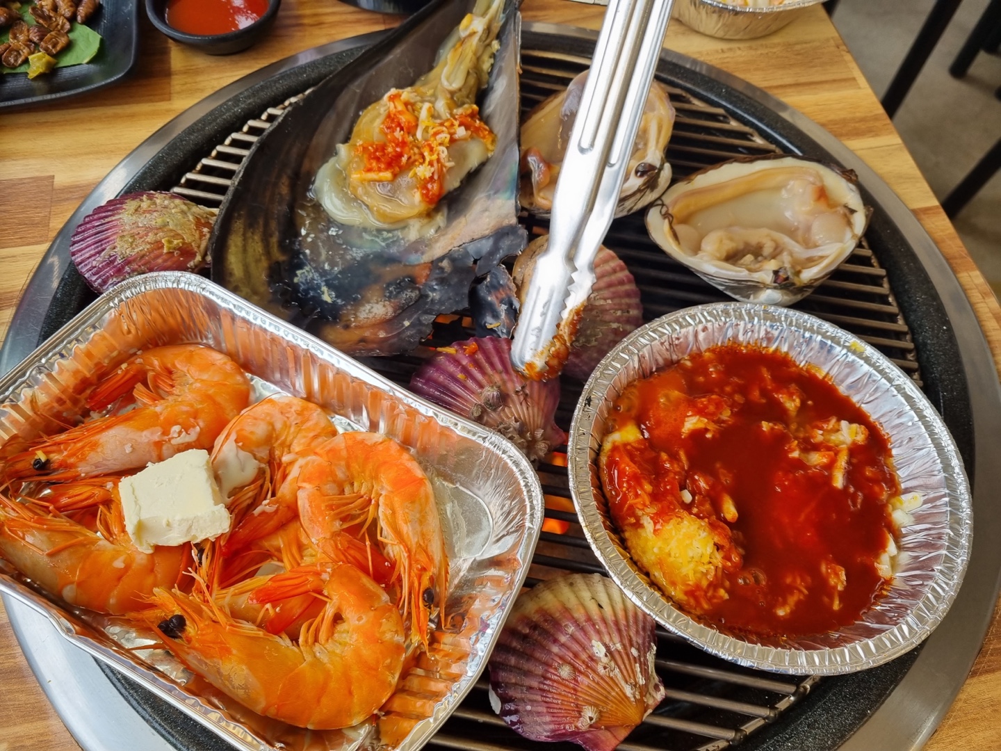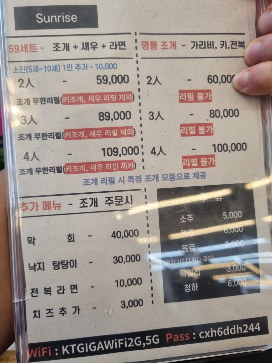 한번 둘러보고 오라는 사장님의 편안한 마인드 강요하지 않아서 좋았습니다. 아직 배가 고프지 않아서 거리를 쭉 돌아보고 출출할때쯤 해뜨는회집으로 왔습니다. 조개구이만 해서 무한리필일 경우 2인에 50000원!? 전부다 오만원 넘는곳이 많던데 여기는 오만원에 무한리필을 먹을수 있습니다. 하지만 저희는 조개+새우+라면 무한리필 2인 59000원으로 먹었습니다.