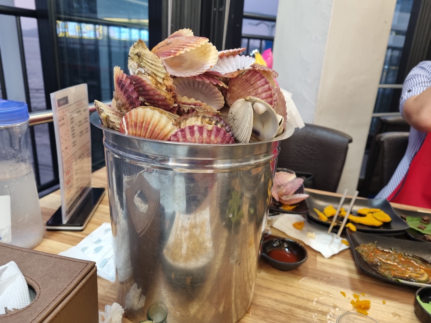 고민안하고 간 조개구이 무한리필집, 친절하시고 가격도 저렴하고 맛있던 조개구이, 배경과 조개구이 맛집으로 최고였던 해뜨는회집, 해산물 사랑하는 저희는 항상 고기보다 해산물이지만 아이가 못먹는게 많기 때문에 잘 못갔는데 이번여행은 해산물 전부 뿌셨습니다.