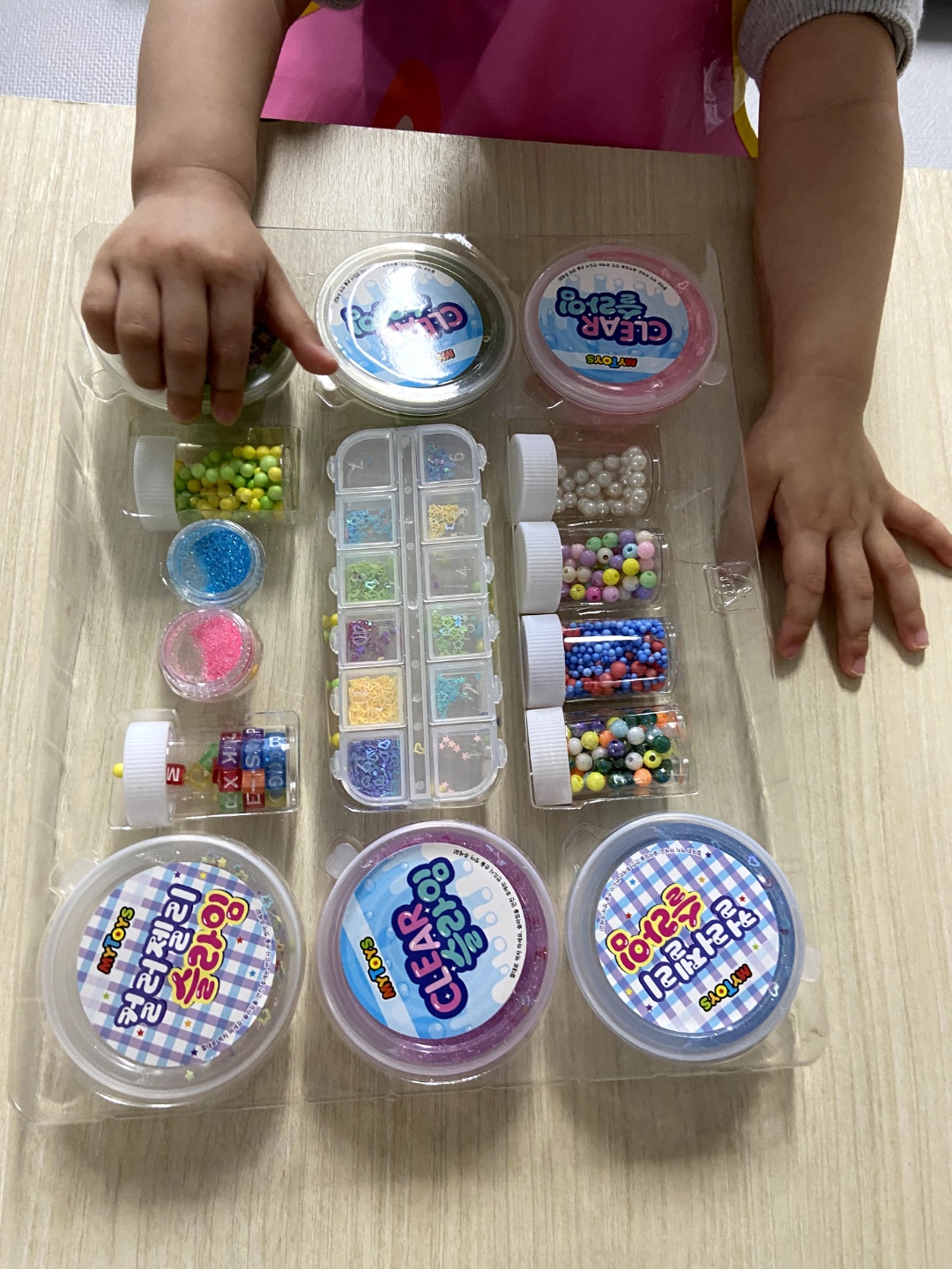 아이들은 촉감놀이를 좋아하기 때문에 여러가지 느낌을 느끼면서 노는것을 제일 좋아합니다. 그래서 평소 쌀 옮기기나 신문지등 종이를 구겨서 놀이를 하기도 합니다. 제가 구매한 슬라임은 6천원도 안하는 가격에 구매해서 여러가지 구성품으로 아이를 더 즐겁게 해줄수 있어서 매우 추천드립니다.