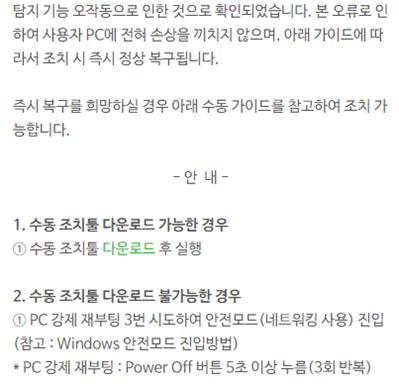 확실히 큰 회사다 보니깐 이후에 조치가 확실한 알약 프로그램은 바로 공지사항과 안내 해결방법을 올렸습니다. 수동 조치가 가능한 경우와 수동 조치가 불가능한 경우를 모두 안내해 쉽게 따라할수 있도록 햇습니다. 사용자분들을 위한 간단한 사과말씀과 정중한 안내 제대로된 완벽한 조치가 아니였나 생각합니다.