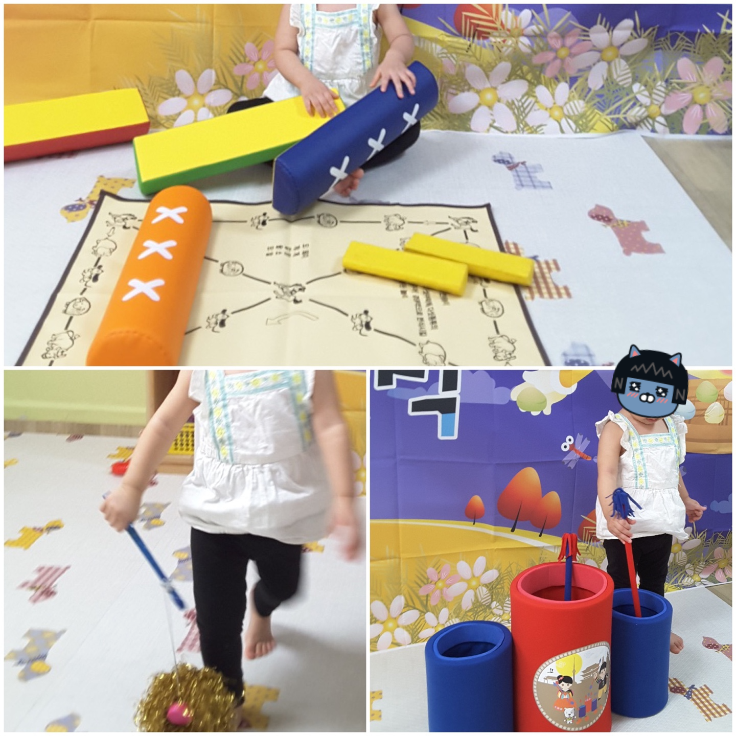 제기차기는 아이들이 하기 처음에는 어렵기 때문에 이렇게 막대기에 줄로 달아서 놀게 하면 좋았습니다. 어린이집에서 이렇게 하시는걸 보고 저도 집에서 여러번 만들어 주었는데 혼자서 제기를 차려고 노력하면서 뿌뜻해하고 성취감을 느기면서 잘 가지고 놀았습니다.
