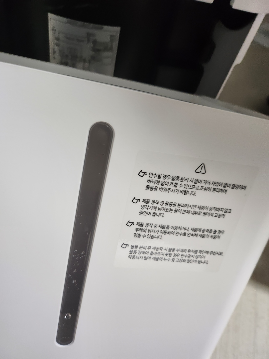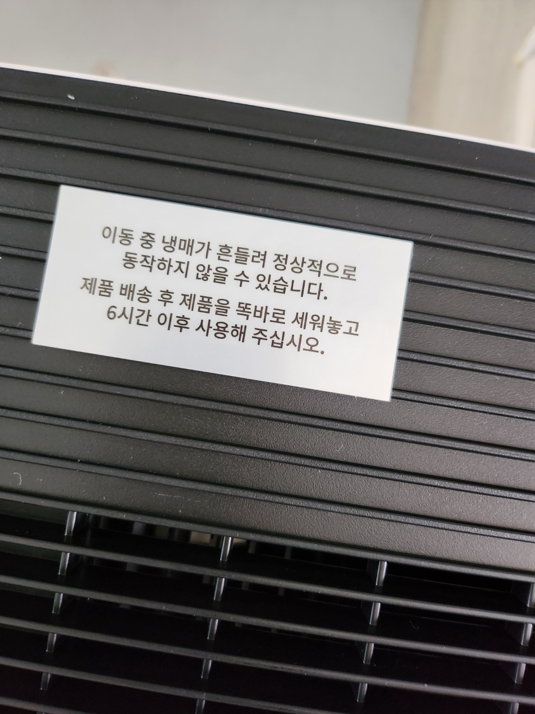 하지만 이번에는 아예 처음 사용하는 한경희 제습기로 구매했는데 외관도 심플하고 이뻐서 너무 마음에 드는 쓰니입니다.어디에 놔도 집분위기와 잘어울려서 일단 만족하며 주의사항을 봅니다. 스티커로 배송중 냉매가 흔들려서 정상작동이 안될수 있다고 집에 도착하고 6시간 이후 사용하라고 써있어서 기다렸습니다.